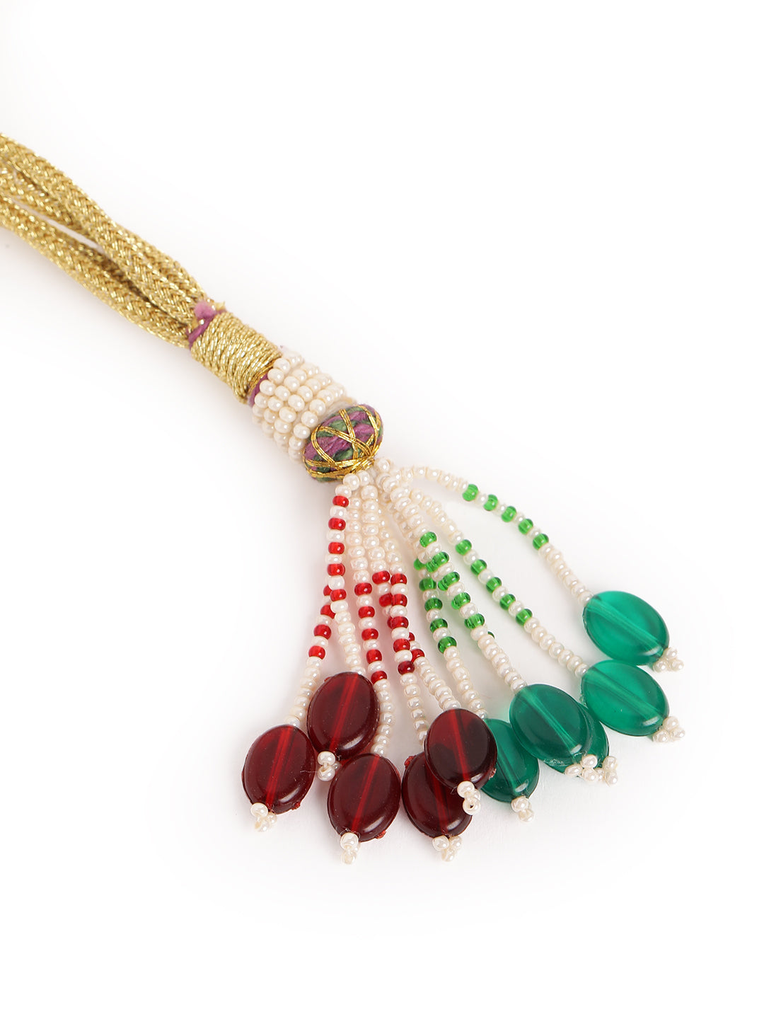 22K Gold Plated, this ethereal set features layered pearls anchored by a dazzling polki centrepiece and light green bead drops. Accompanied by earrings, it offers the perfect harmony of royal tradition and modern bridal finesse. Secured with adjustable drawstring closure. This comes with 1 year plating warranty, anti-tarnish for lasting shine and comfort.
