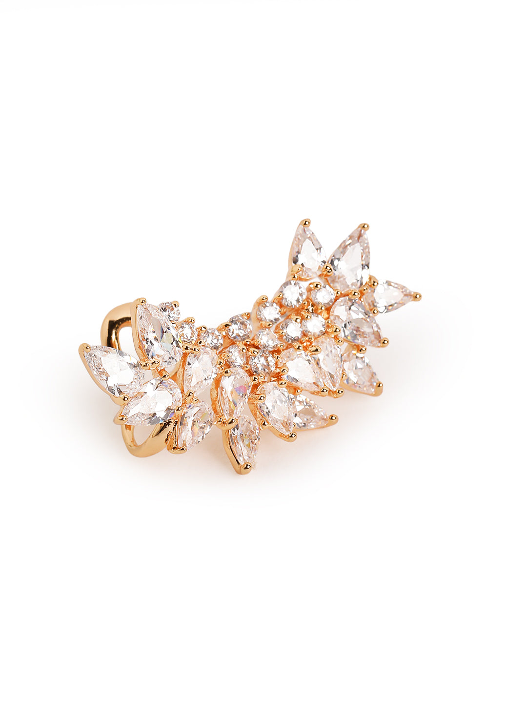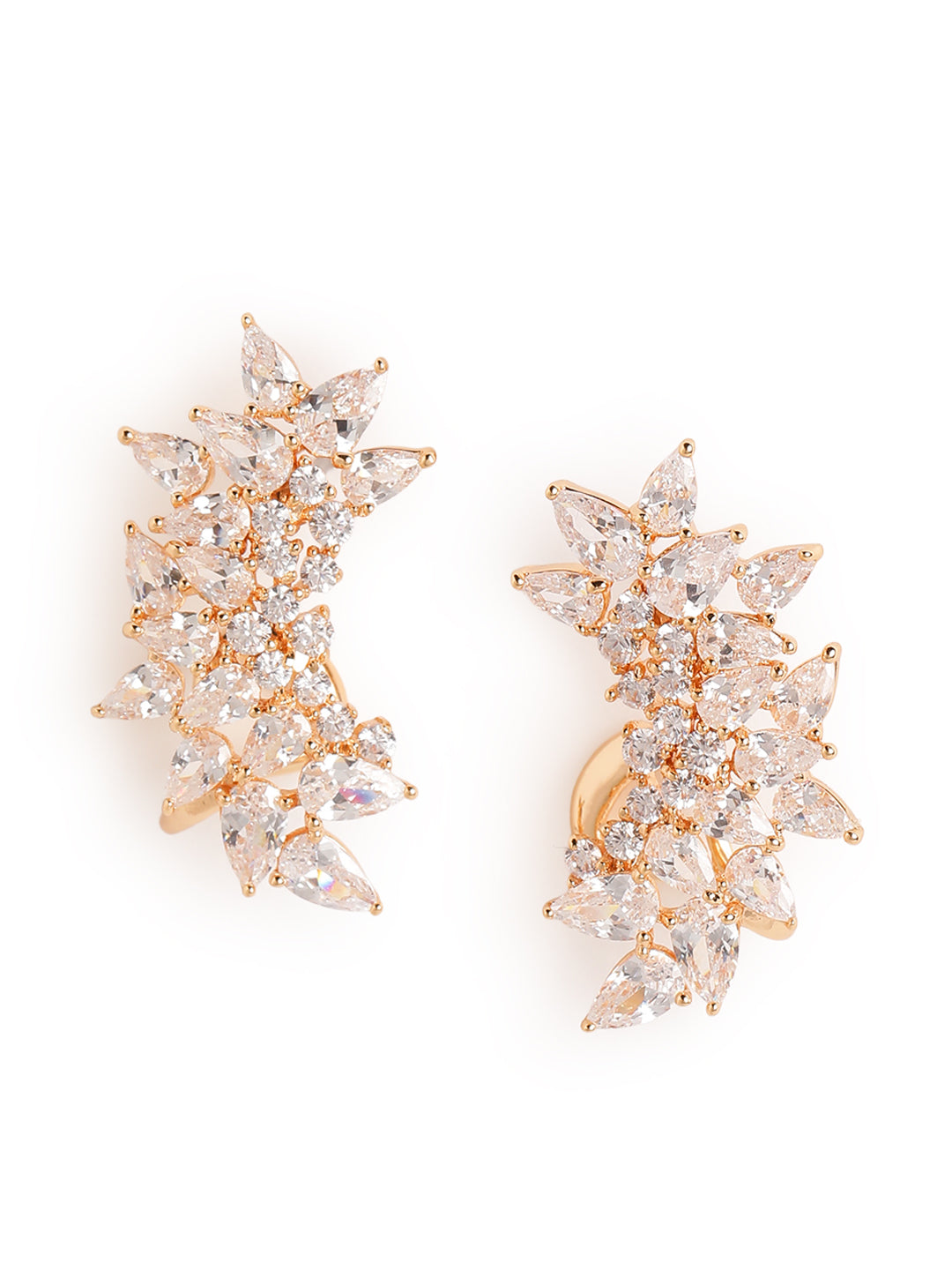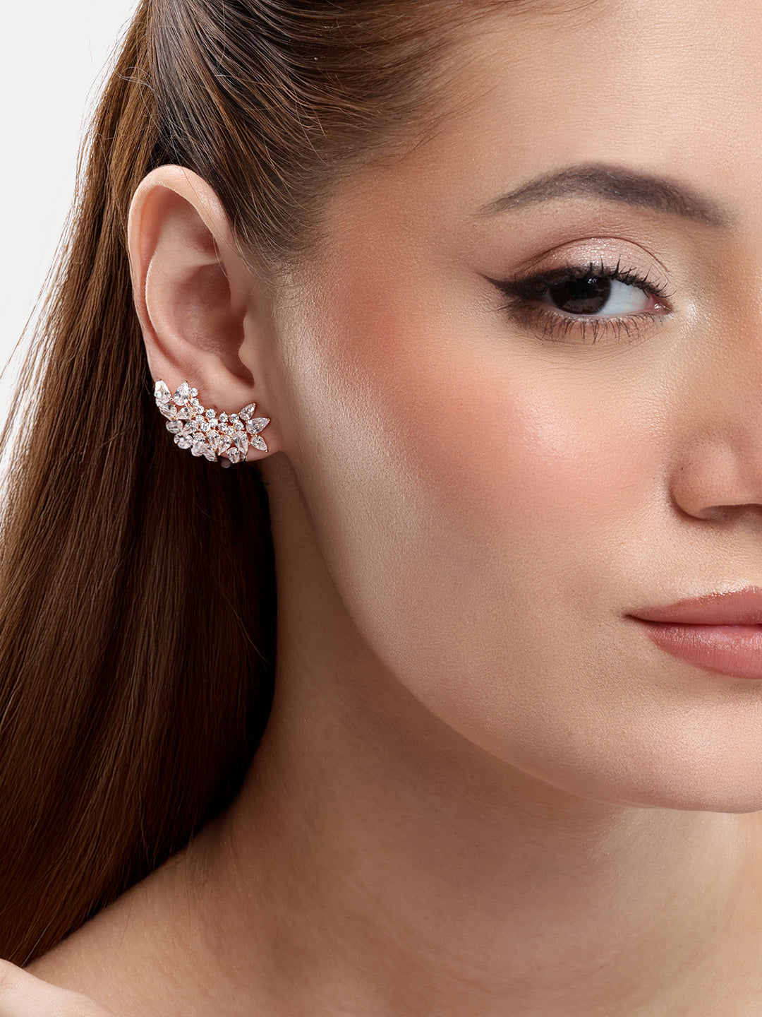 Add a touch of brilliance to your look with these leaf-inspired cluster earrings. Designed in a graceful curved silhouette, they sparkle with finely set AAA cubic zircon stones that catch the light from every angle. Perfect for weddings, festive occasions, or elevating an evening outfit, these earrings bring together elegance and modern charm. Secured with puch-back closure. It has 1 year plating warranty and is anti-tarnish for lasting shine and comfort.