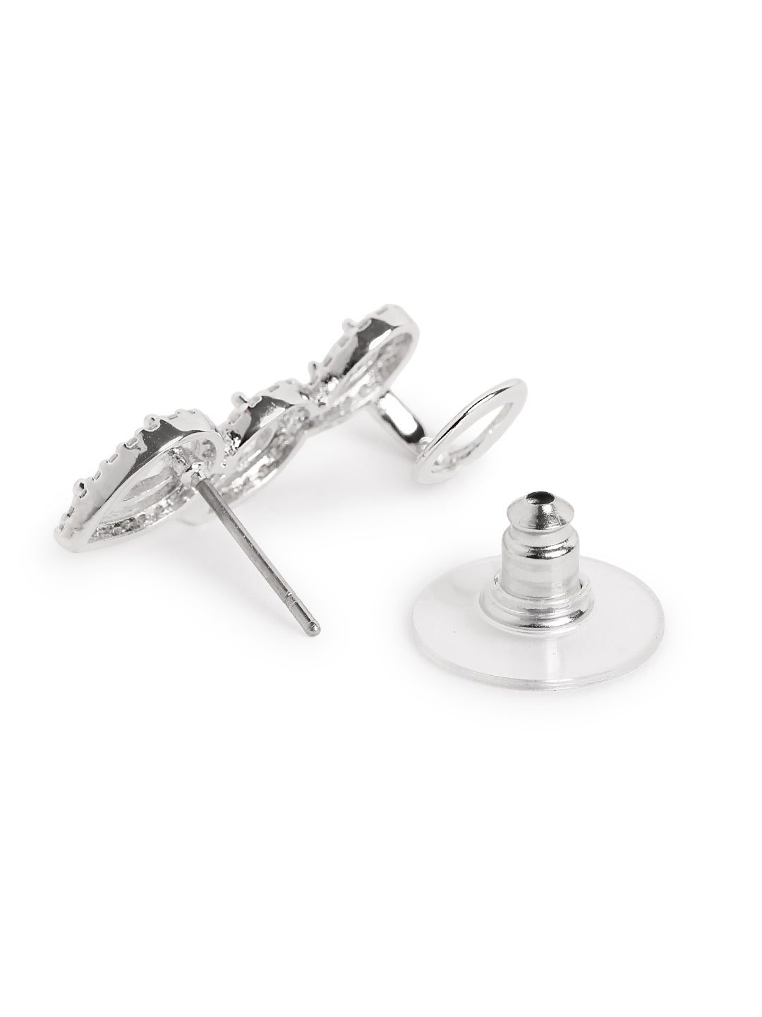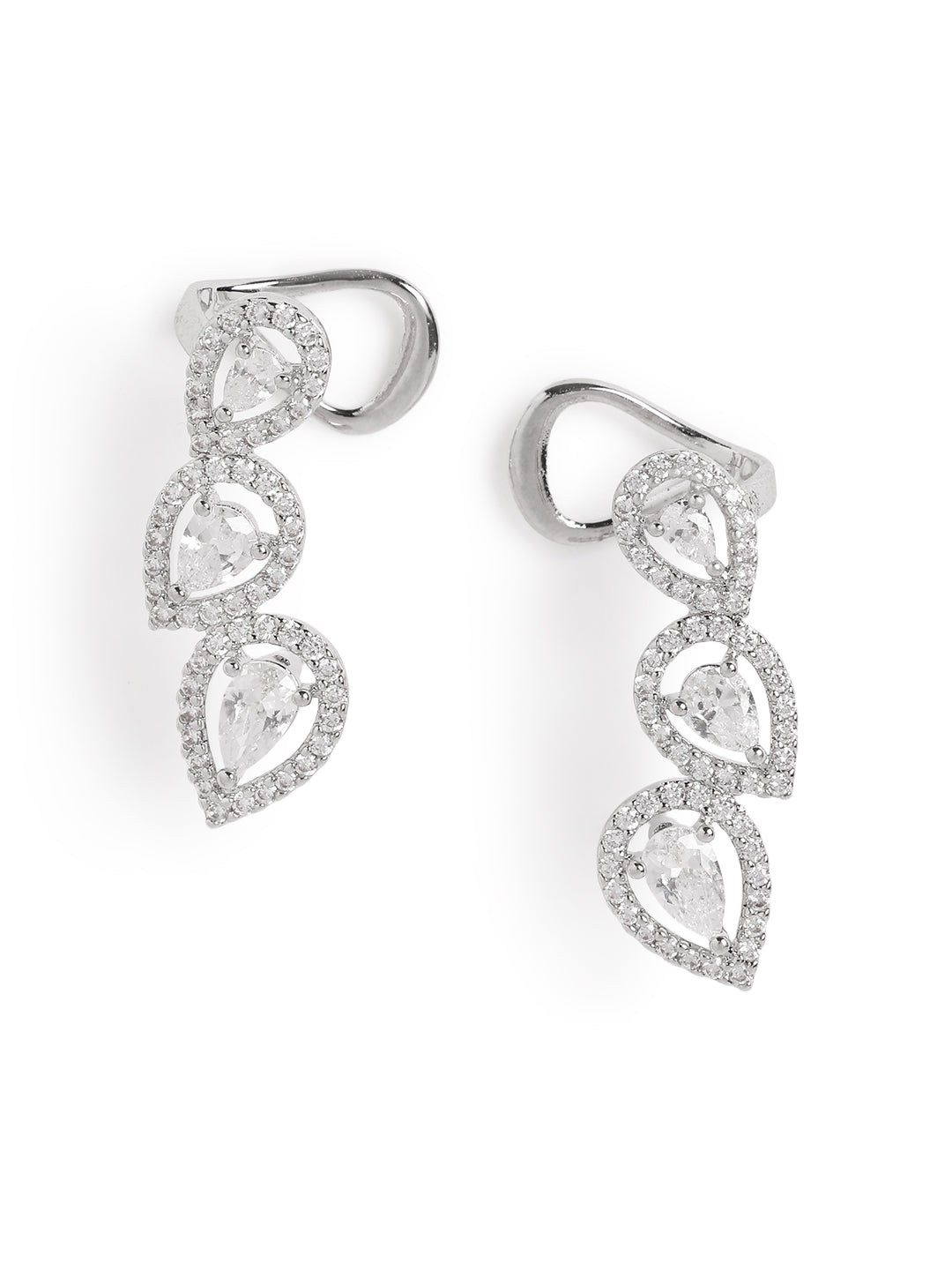 Add a touch of brilliance to your look with these leaf-inspired earrings. Designed in a graceful curved silhouette, they sparkle with finely set AAA cubic zircon stones that catch the light from every angle. Perfect for weddings, festive occasions, or elevating an evening outfit, these earrings bring together elegance and modern charm. Secured with push-back closure. It has 1 year plating warranty and is anti-tarnish for lasting shine and comfort.