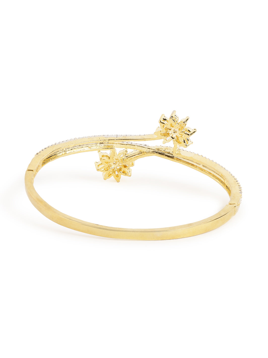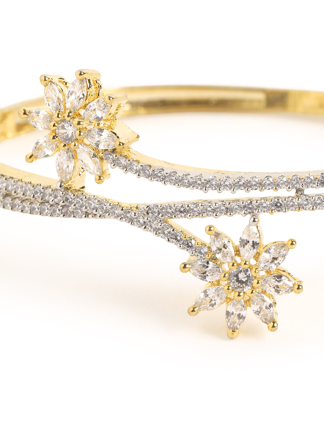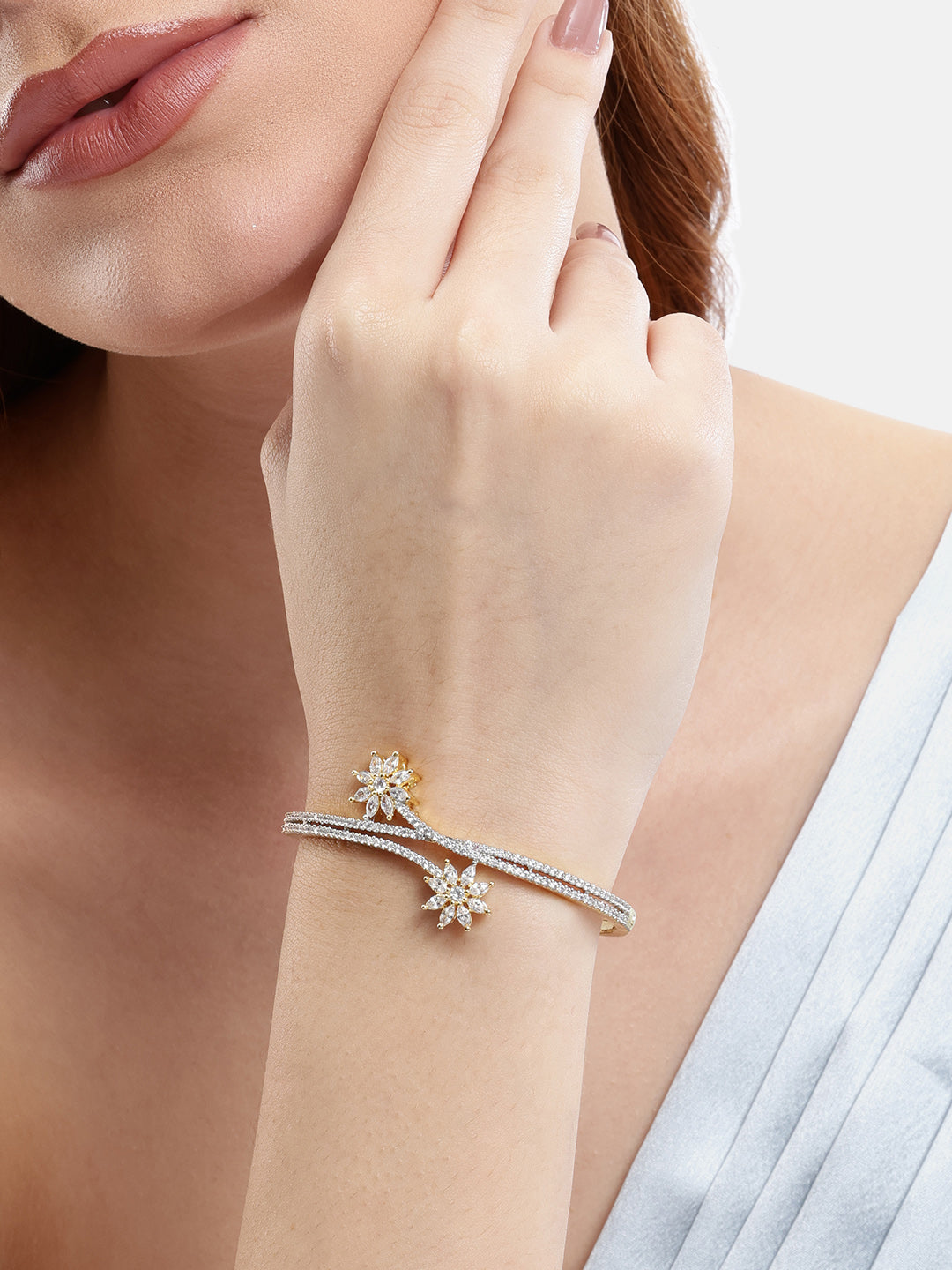 Add a floral sparkle to your look with this flower inspired bracelet, designed with shimmering marquise-cut AAA Cubic Zircon stones and a sleek double-studded band. Elegant and versatile, it’s perfect for weddings, cocktail nights, or festive celebrations. Secured with clip on closure. This comes with 1 year plating warranty, anti-tarnish for lasting shine and comfort. Size upto 2.6