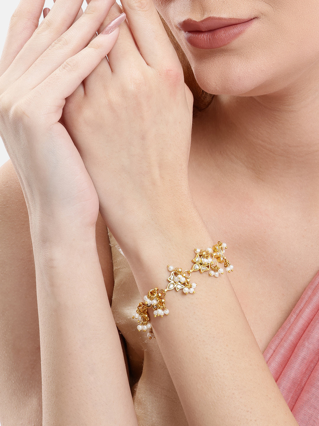 22K Gold toned, this bracelet showcases a mini kundan motifs adorned with kundan stones. The golden accents and petal-shaped connectors enhance the regal aesthetic, making it a timeless piece to elevate any ethnic outfit. Secured with S-hook closure. This comes with 1 year plating warranty, anti-tarnish for lasting shine and comfort.