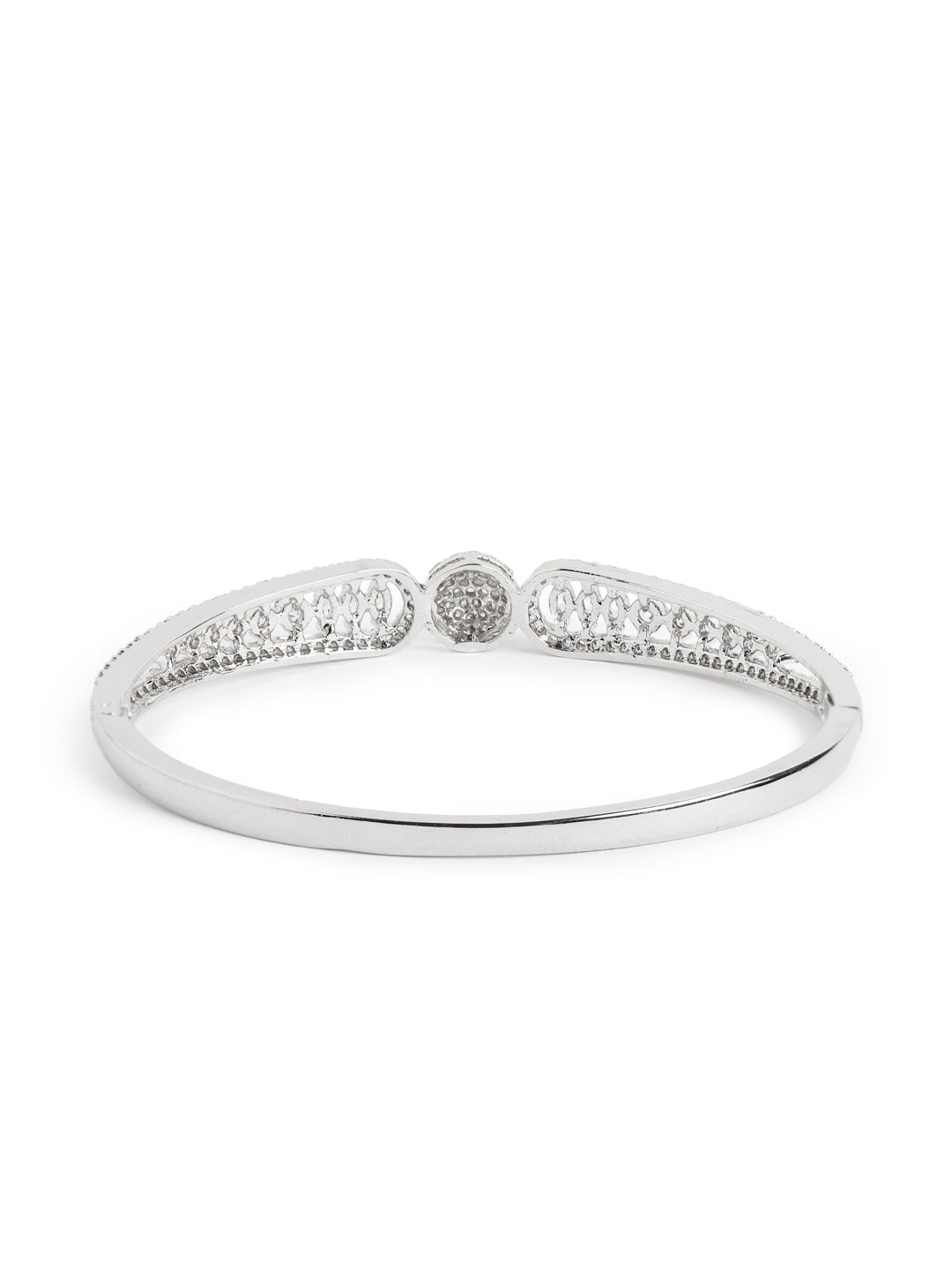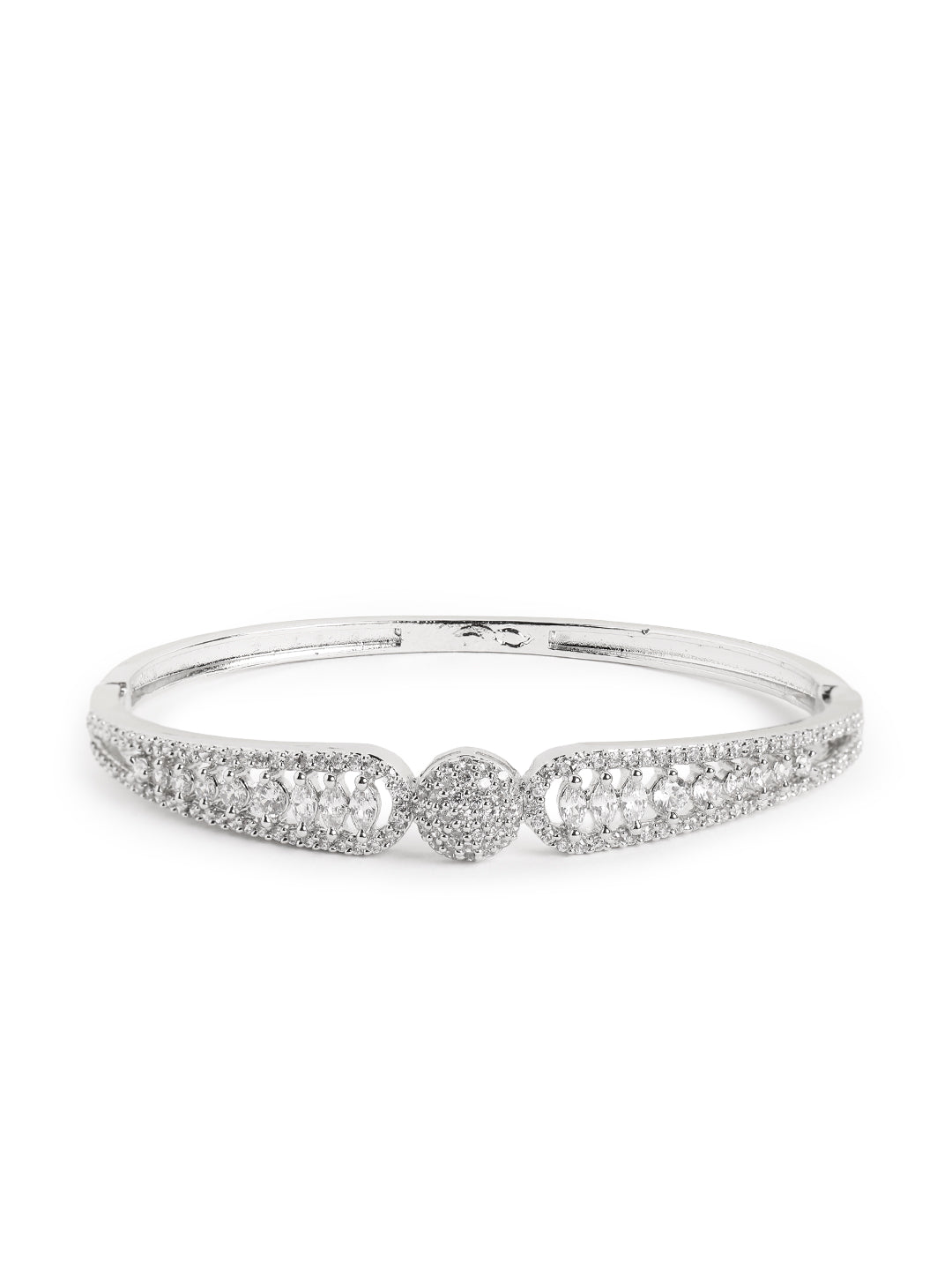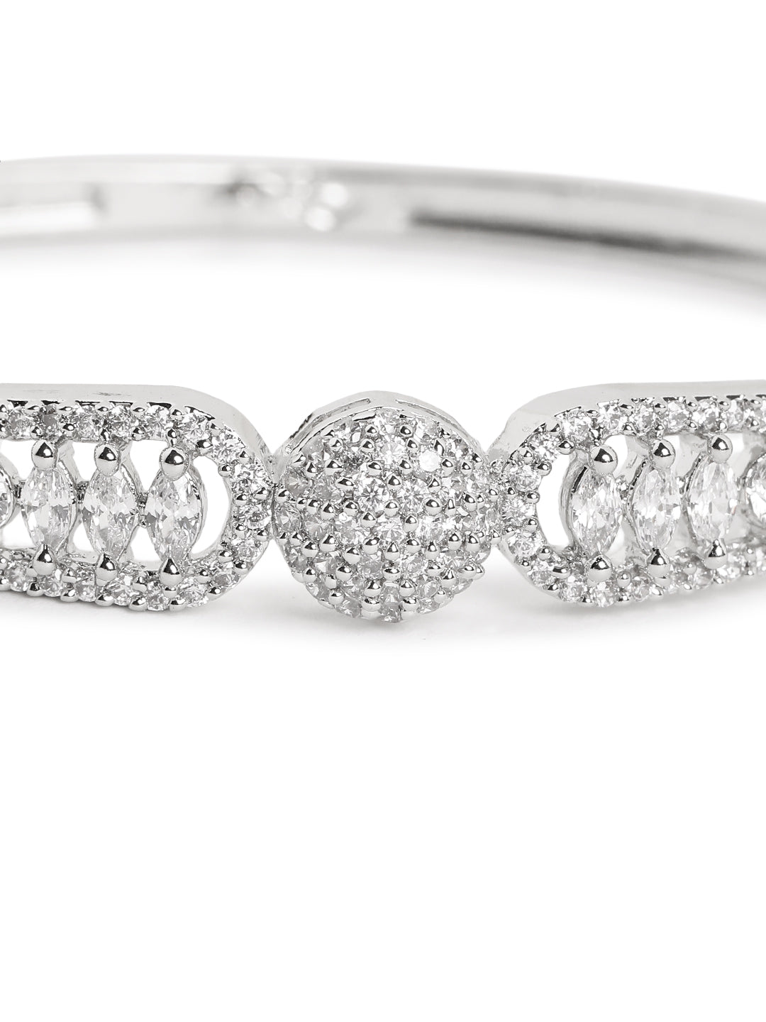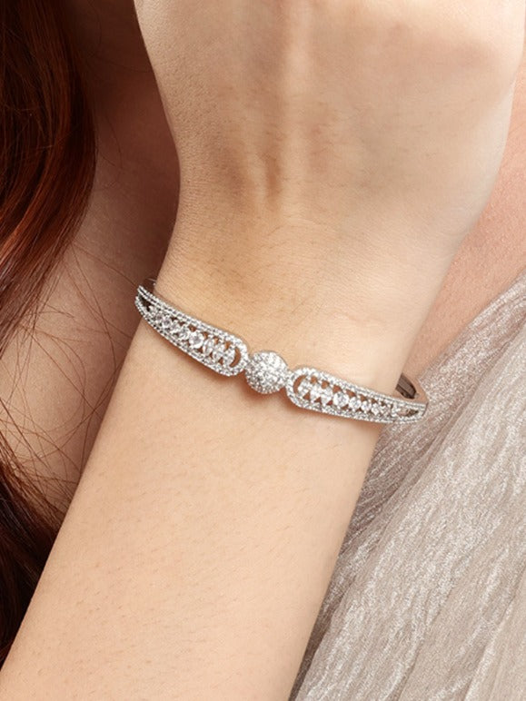 Elevate your look with this sparkling sphere bracelet, designed with a dazzling AAA Cubic Zircon stones studded centerpiece and rows of shimmering cubic zircon on each side. Bold yet elegant, it’s the perfect choice for cocktail nights, parties, or festive occasions. Secured with clip on closure. This comes with 1 year plating warranty, anti-tarnish for lasting shine and comfort. Size upto 2.6