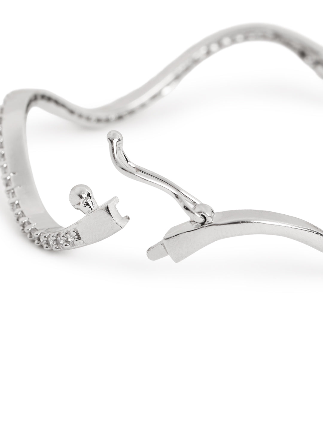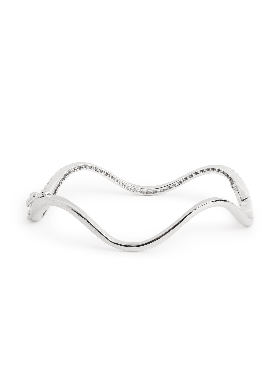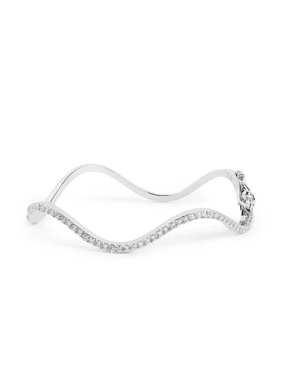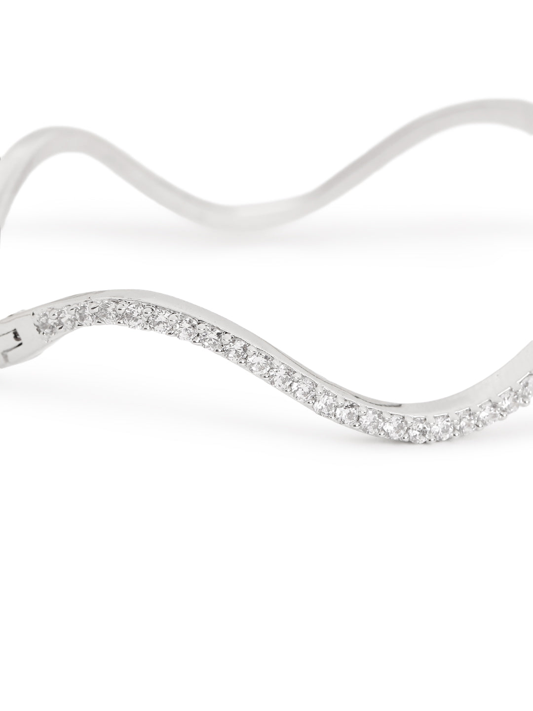 This sparkling zircon studded wavy bracelet, designed to add effortless glamour to any look. Its fluid curve, set with dazzling AAA Cubic Zircon stones, creates a striking yet graceful silhouette. Perfect for cocktail parties, weddings, or a chic night out. Lightweight and versatile, makes it perfect for both daily wear and special occasions. Secured with clip on closure. This comes with 1 year plating warranty, anti-tarnish for lasting shine and comfort. Size upto 2.6