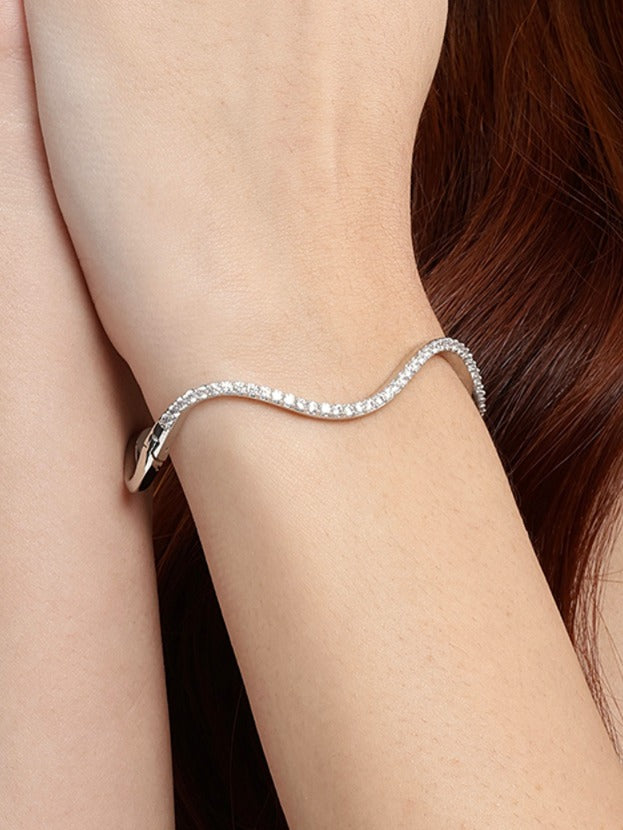 This sparkling zircon studded wavy bracelet, designed to add effortless glamour to any look. Its fluid curve, set with dazzling AAA Cubic Zircon stones, creates a striking yet graceful silhouette. Perfect for cocktail parties, weddings, or a chic night out. Lightweight and versatile, makes it perfect for both daily wea