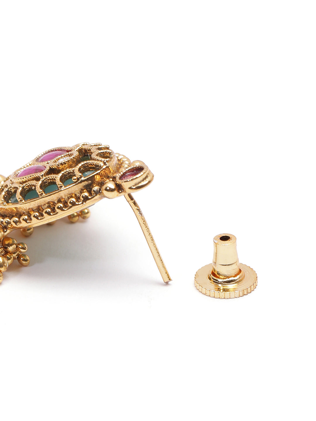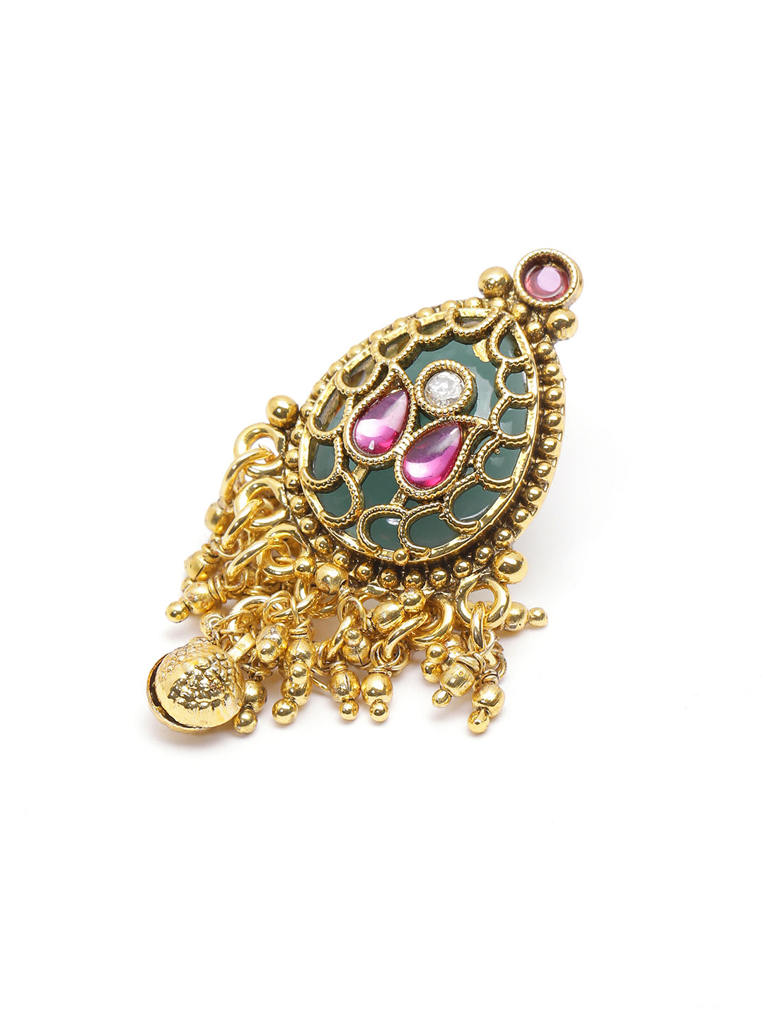 A beautifully detailed traditional choker set for women with layered pearl strands and a statement pendant crafted with stone work, crystals, and coloured beads. The matching earrings echo the same traditional motif, complete with golden bead fringes for a rich ethnic finish. Secured with adjustable drawstring closure. This comes with 1 year plating warranty, anti-tarnish for lasting shine and comfort.