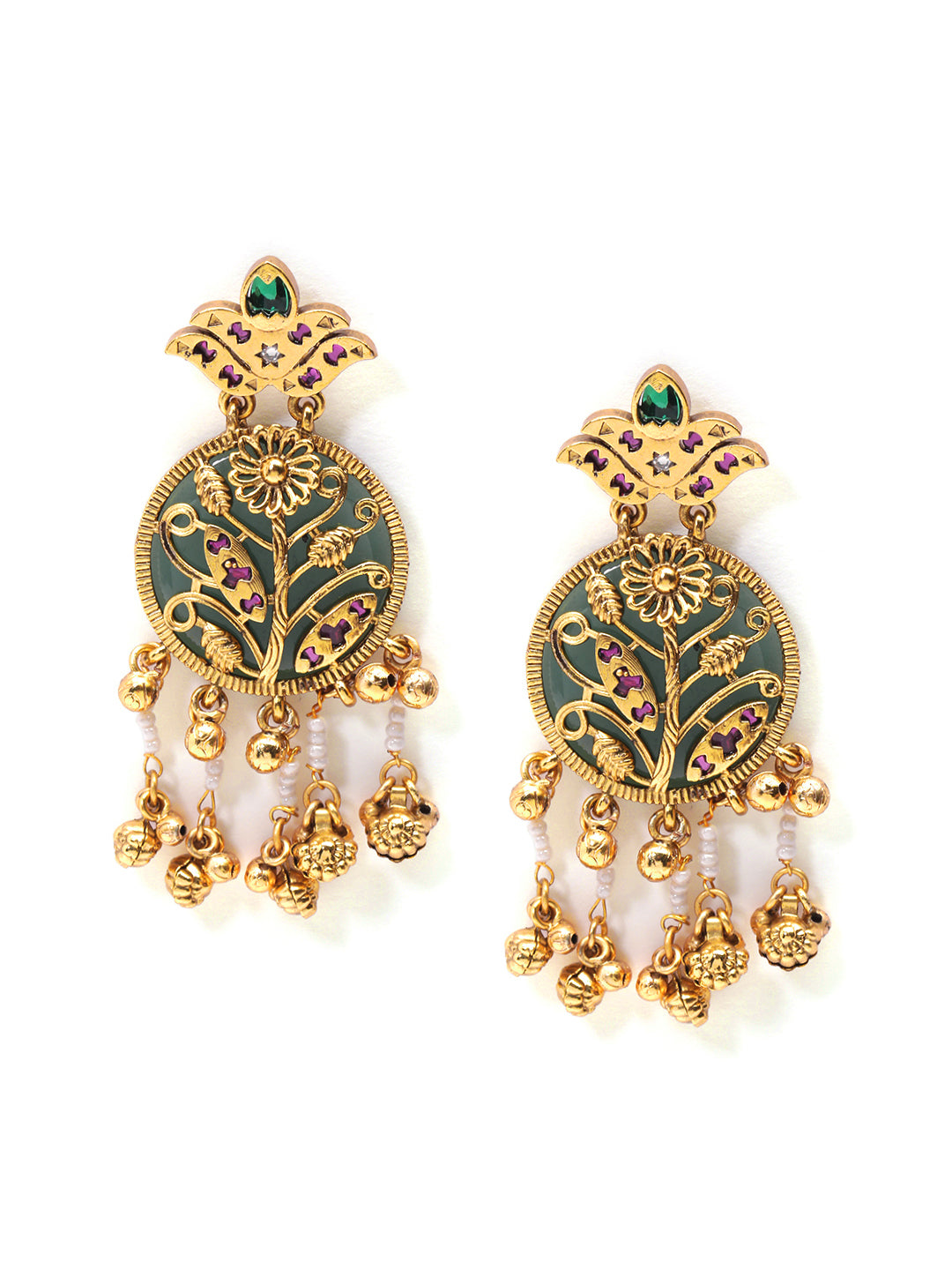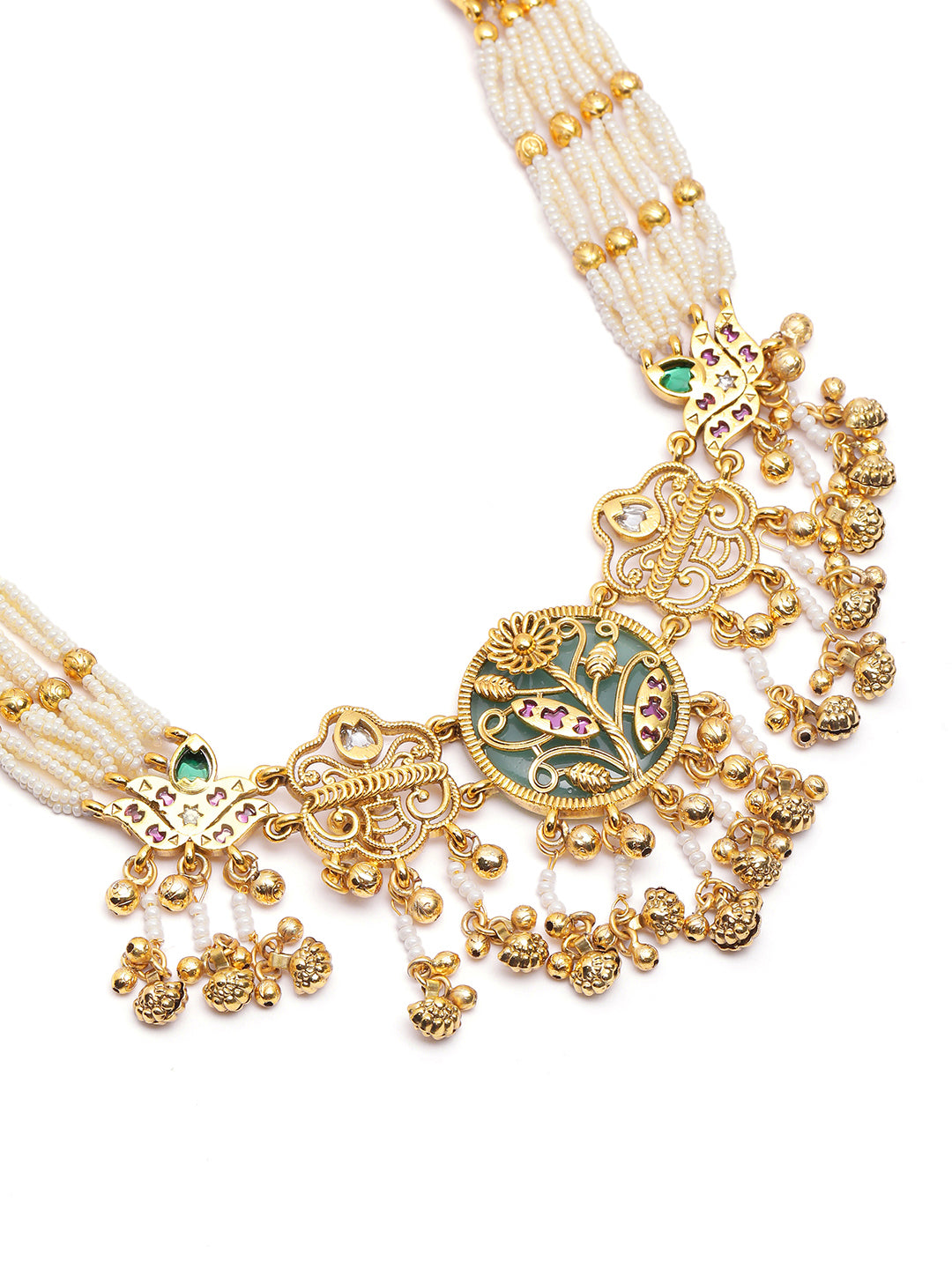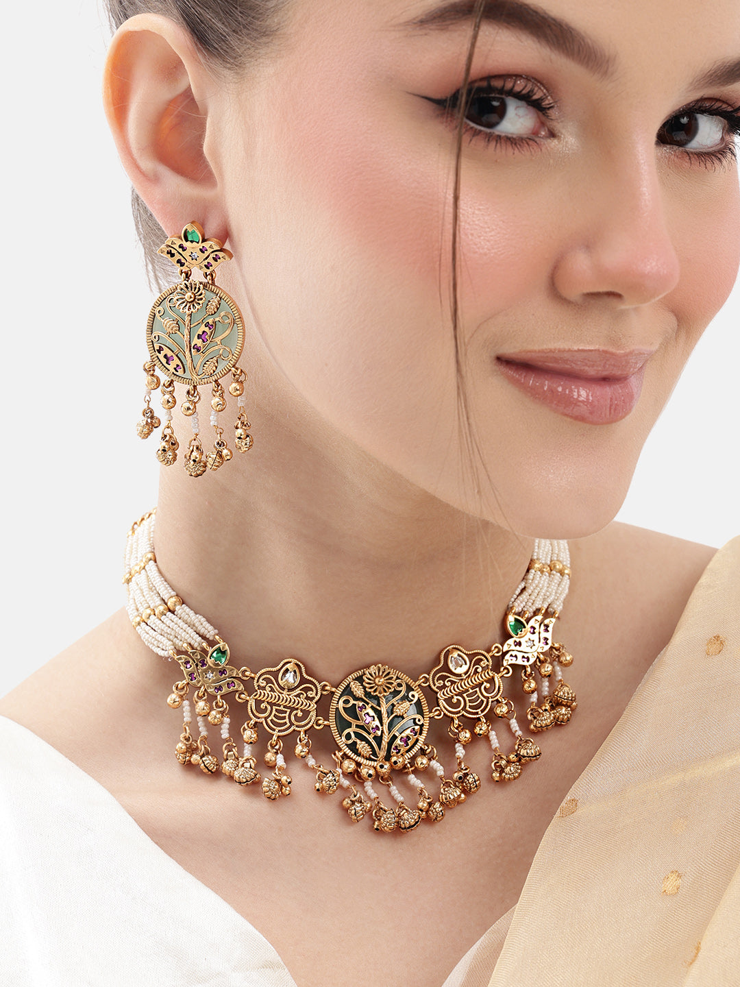 A heritage-inspired gold choker set for women with hand-detailed floral enamel centres, pearl accents, and ornate bead danglers. Lightweight yet statement-making, it adds a graceful, vintage touch to any festive ensemble. The design blends temple-inspired motifs with delicate danglings, creating a traditional yet elegant look. Secured with adjustable drawstring closure. This comes with 1 year plating warranty, anti-tarnish for lasting shine and comfort.