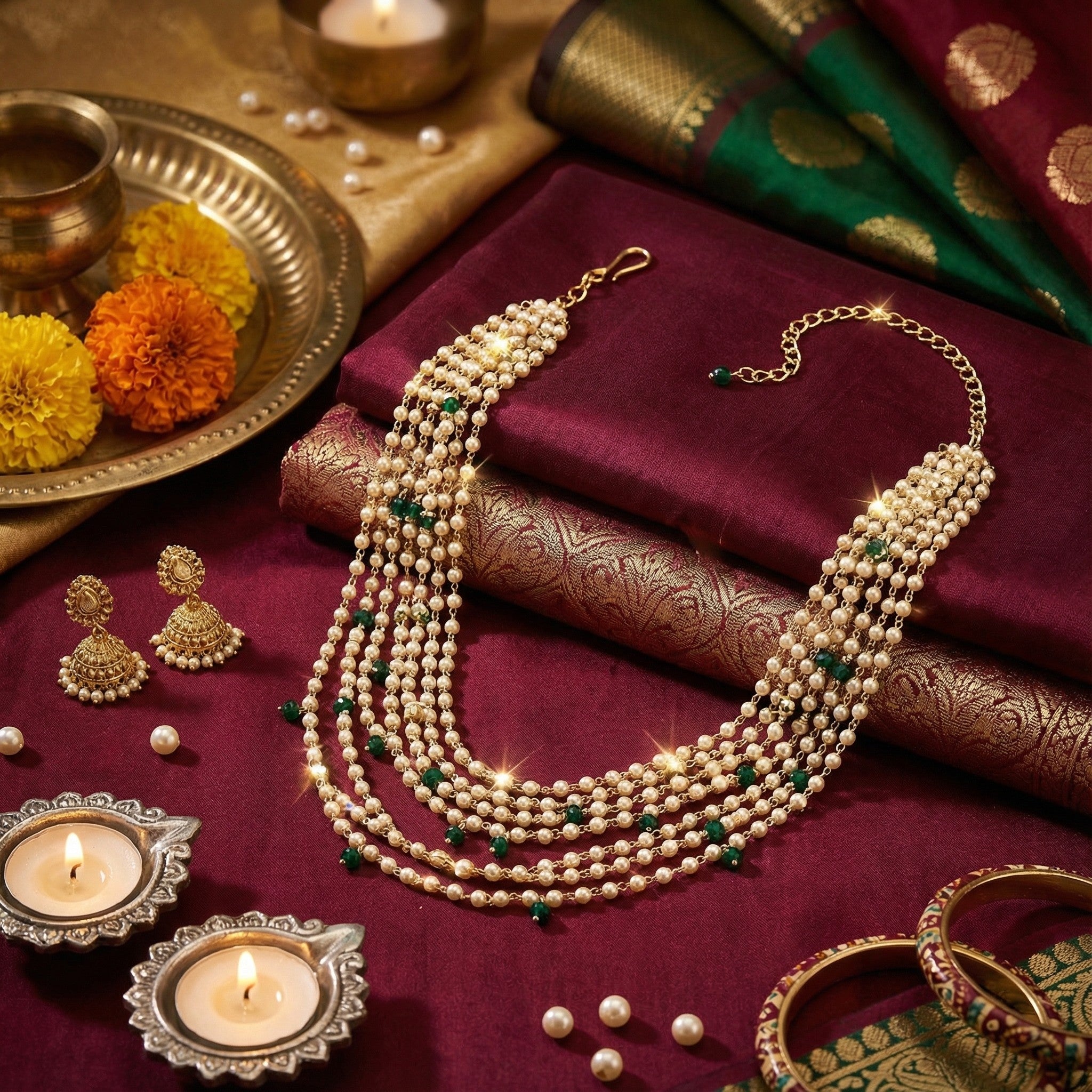 This pearl necklace instantly elevates any outfit. The multiple strands look beautifully on the neck, and the green stones add a subtle pop of colour without overpowering the pearls. I wore it for a formal dinner with a saree, and everyone thought it was real heritage jewellery. The gold plating gives it a warm glow, and it’s light enough to wear comfortably all evening.