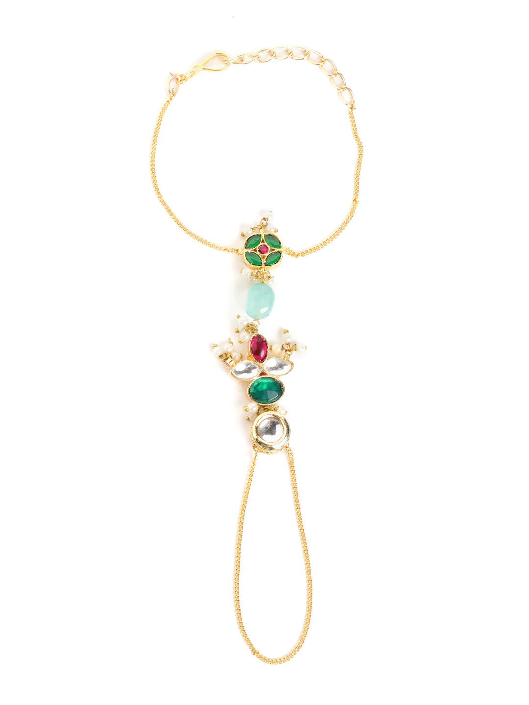 Bring understated elegance to your wrist with this gold-plated chain hathphool bracelet, featuring vibrant traditional stones arranged in a minimalist design. Perfect for festive or everyday looks, this bracelet offers anti-tarnish brilliance & a one-year plating warranty. Secured with an S-hook closure, it’s an id