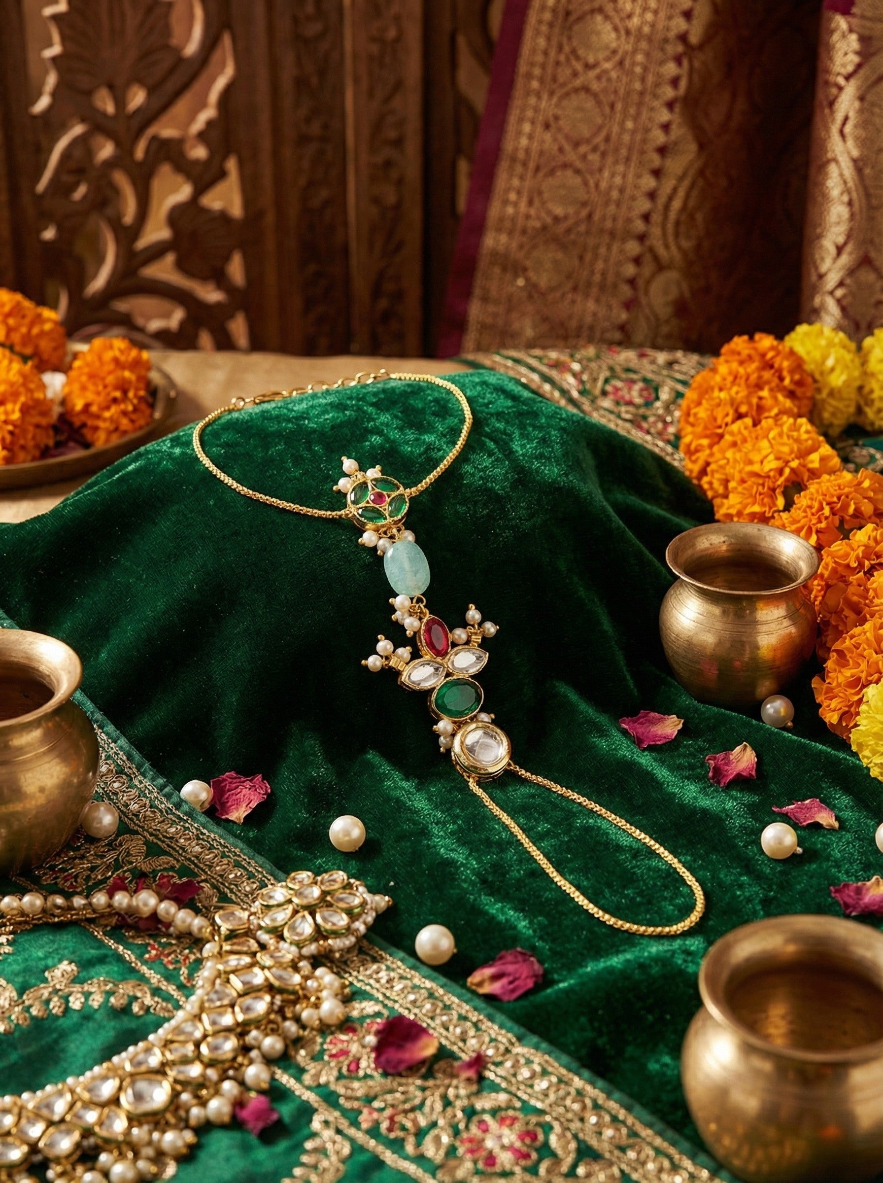 Bring understated elegance to your wrist with this gold-plated chain hathphool bracelet, featuring vibrant traditional stones arranged in a minimalist design. Perfect for festive or everyday looks, this bracelet offers anti-tarnish brilliance & a one-year plating warranty. Secured with an S-hook closure, it’s an ideal accessory for those who love culture with a modern twist.