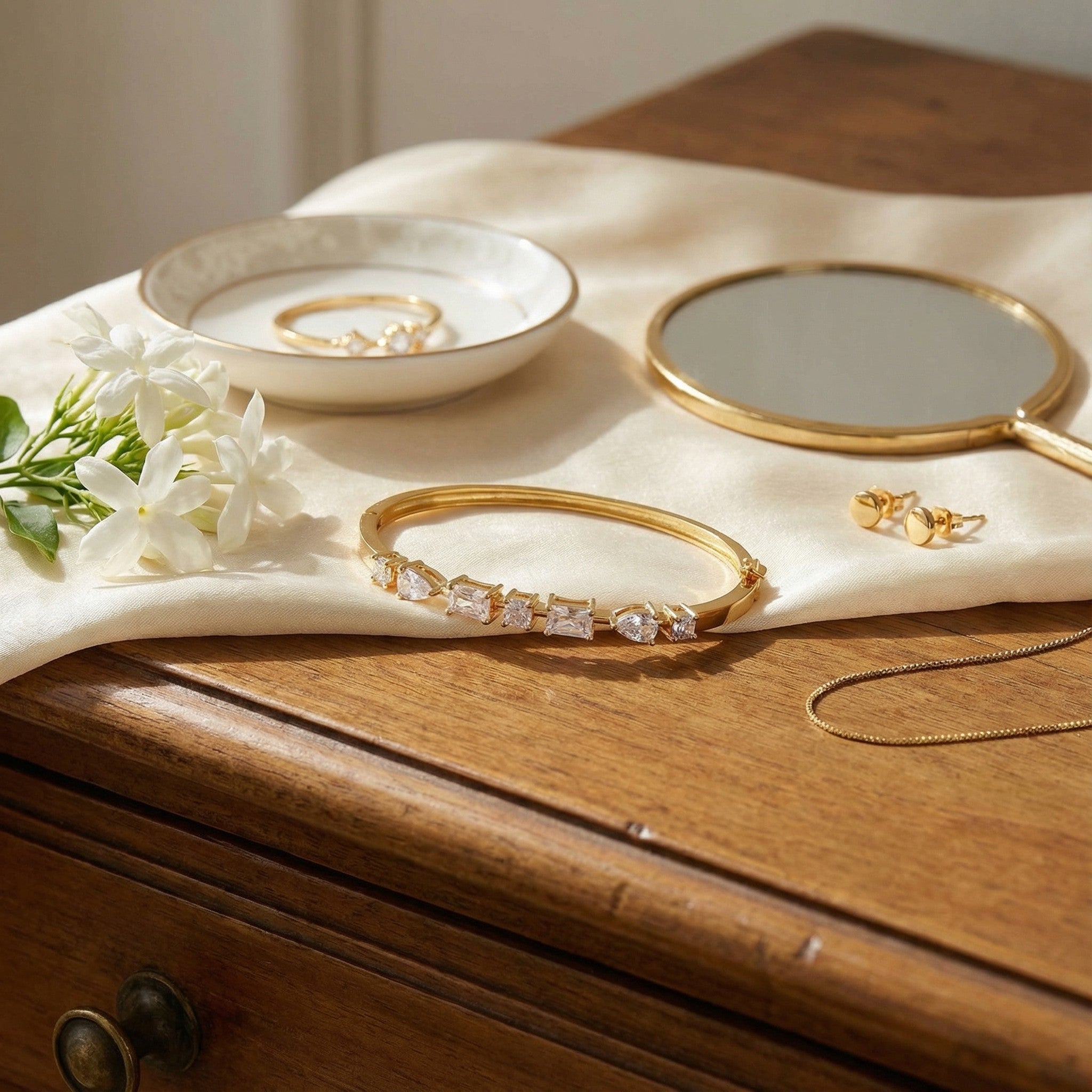 To keep your jewellery shining like new, gently clean it with a soft cloth after use. Store it in a cool, dry place away from direct sunlight, moisture, and perfumes. Use soft pouches or dedicated jewellery boxes to prevent scratches and ensure lasting brilliance.