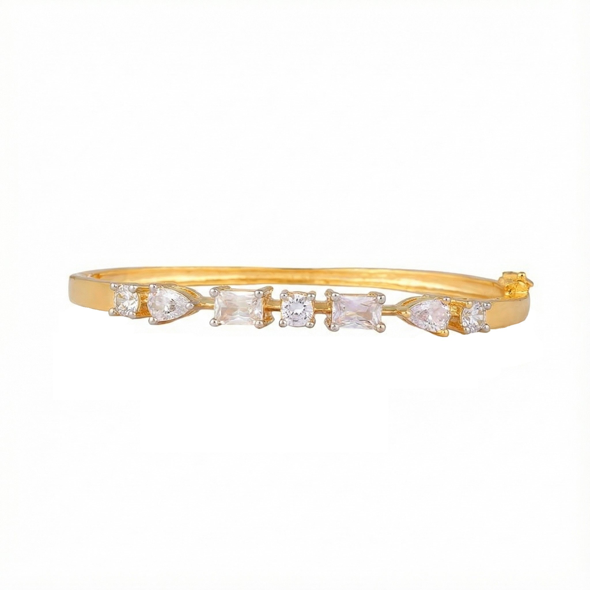 Gracefully aligned AAA Cubic Zircon stones steal the spotlight in this radiant openable bracelet, framed by different shape of fine-cut zircon stones. Secured with clip on closure. This comes with 1 year plating warranty, anti-tarnish for lasting shine and comfort.