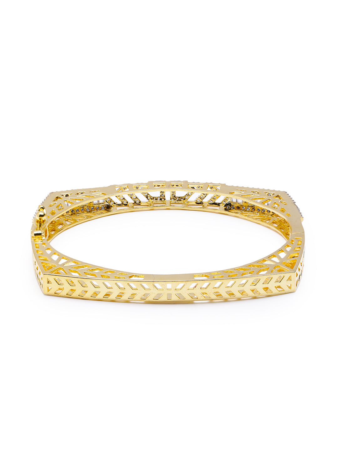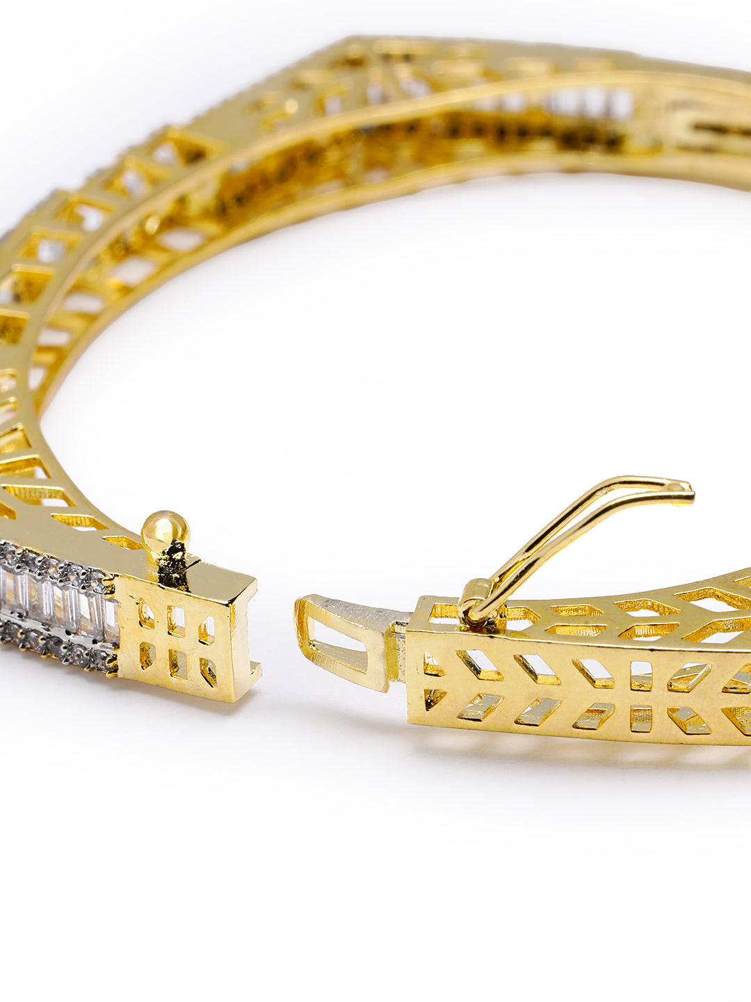 A modern twist on timeless elegance, this openable bracelet features a sleek bunch of baguette cut AAA Cubic Zircon stones, set gracefully meeting at a vibrant floral cluster of zircon. Secured with clip on closure. This comes with 1 year plating warranty, anti-tarnish for lasting shine and comfort. Fits up to 2.6
