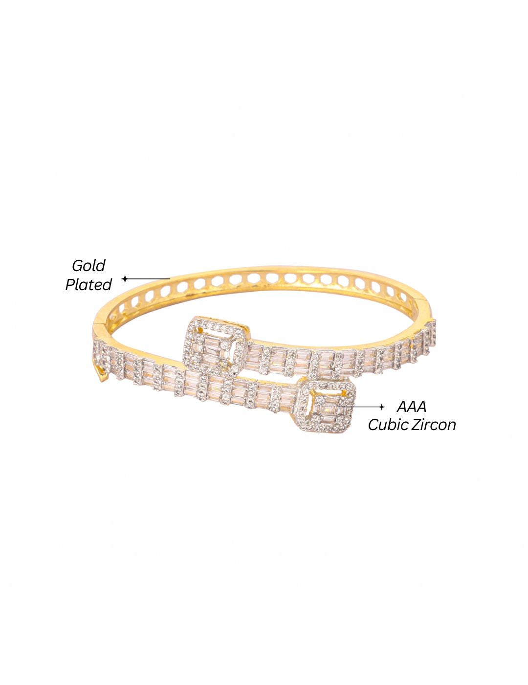 An exquisite bracelet adorned with baguette-cut AAA cubic zircon stones and framed with sparkling halos, exuding timeless elegance and sophistication. Ideal for both festive celebrations and evening glamour. Secured with clip on closure. This comes with 1 year plating warranty, anti-tarnish for lasting shine and comfor