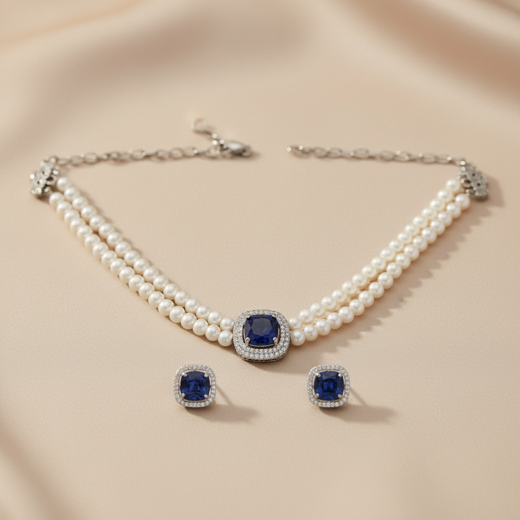 Elegant pearl choker featuring striking blue emerald centre piece. Designed with anti-tarnish and anti-allergic properties, offering both style and comfort, making perfect for any special occasion.