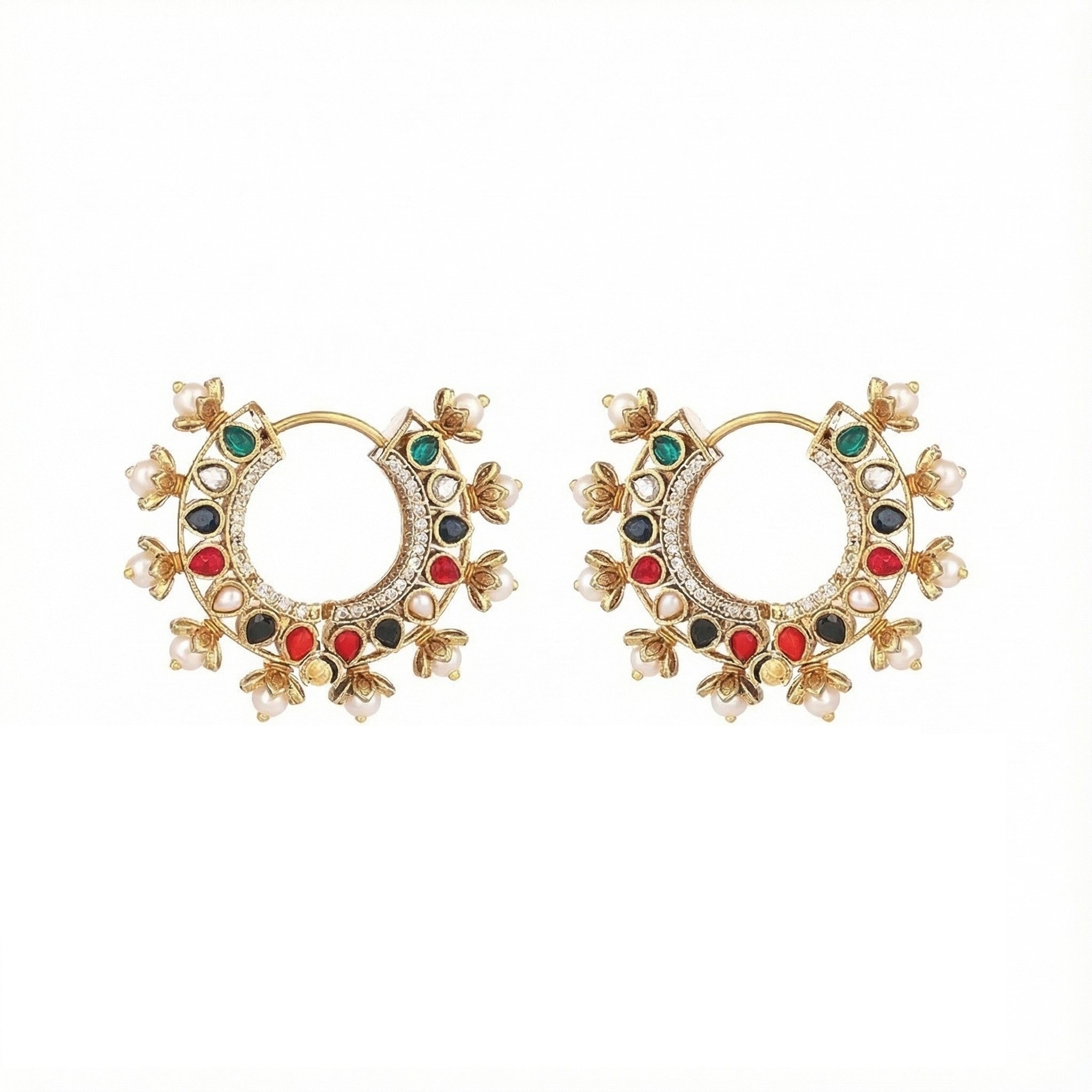 Gold toned, A vibrant hoop earrings adorned with ruby-hued teardrop & Green stones, surrounded by miniature gold florals and pearl droplets. The structured yet delicate design channels festive grandeur, ideal for bridal events or traditional celebrations. Secured with lever back closure. This comes with 1 year plat