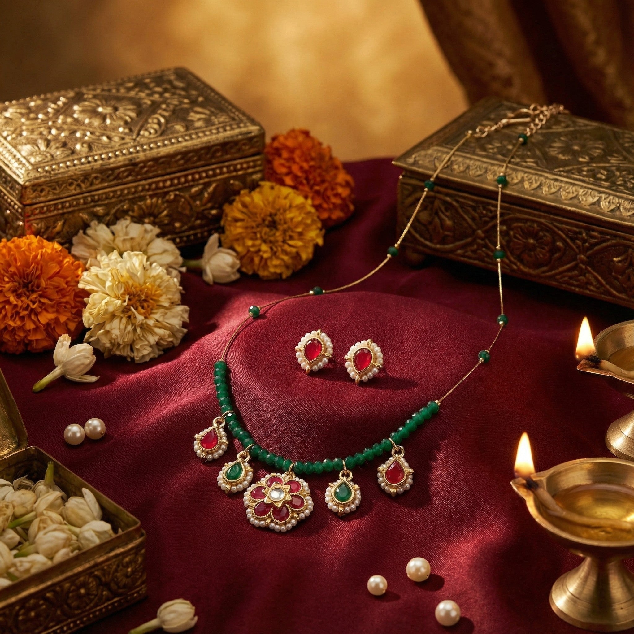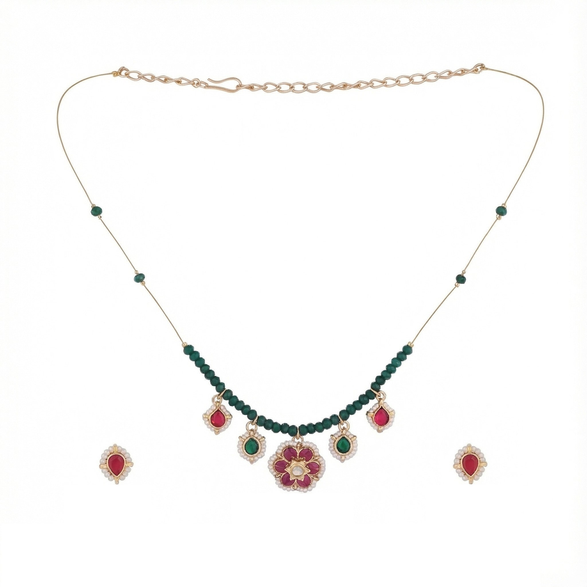 Brighten up your festive look with this gold-toned invisible chain necklace set, set featuring a pink and green color design, highlighted with delicate pearls. The centre piece is surrounded by mini charms, strung together with emerald toned beads for an elegant finish. Lightweight and versatile, it’s a graceful choice for weddings and festive celebrations. Minimalist gold necklace designed with anti-tarnish comfort, it includes a one-year plating warranty and an anti tarnish brilliance. Secured with an adjustable closure for a seamless fit.