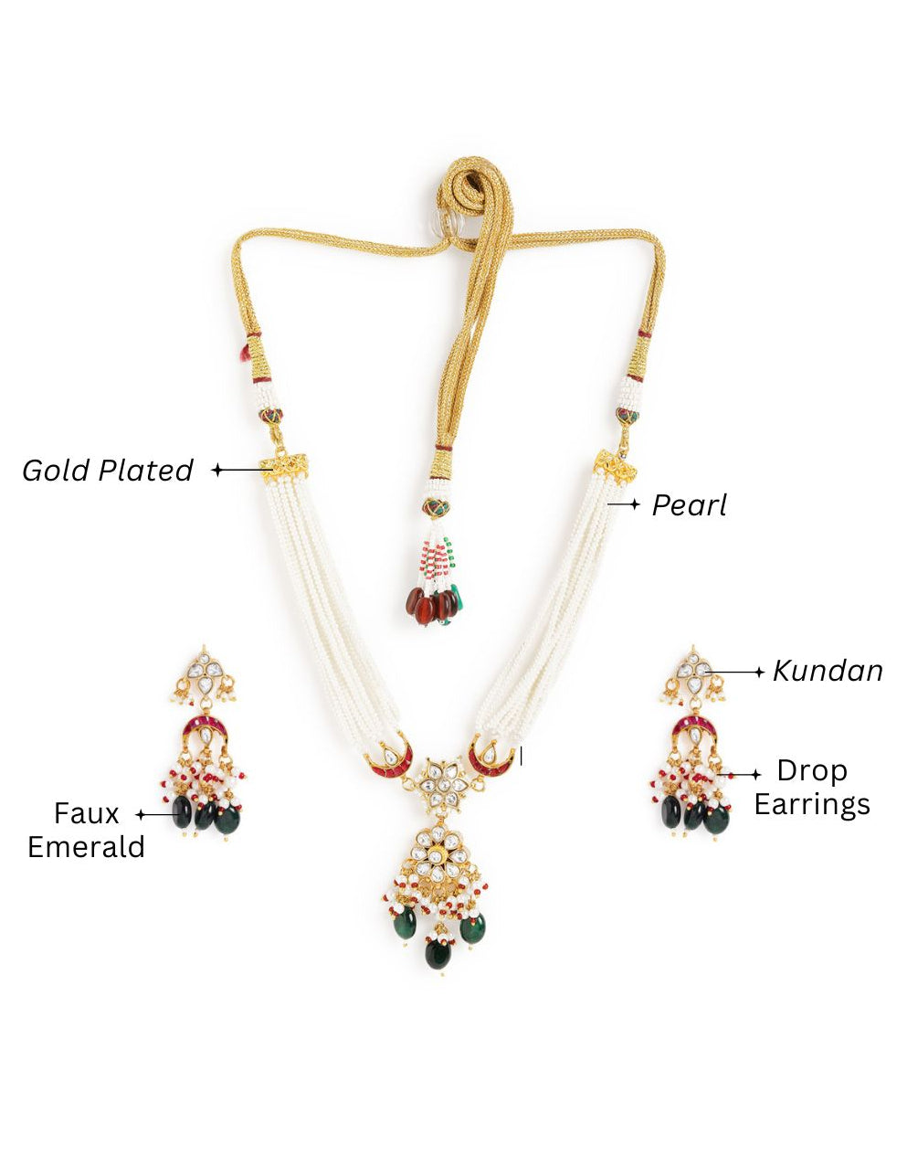22K Gold Plated, this ethereal set features layered pearls anchored by a dazzling polki centrepiece and light green bead drops. Accompanied by earrings, it offers the perfect harmony of royal tradition and modern bridal finesse. Secured with adjustable drawstring closure. This comes with 1 year plating warranty, anti-t