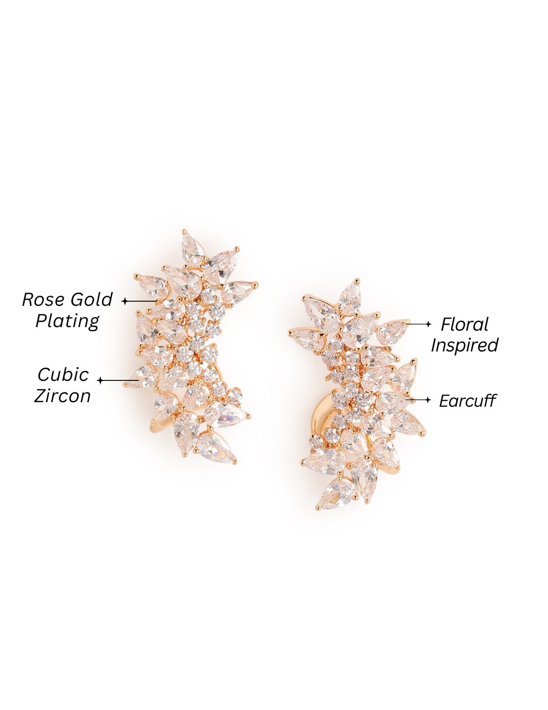 Add a touch of brilliance to your look with these leaf-inspired cluster earrings. Designed in a graceful curved silhouette, they sparkle with finely set AAA cubic zircon stones that catch the light from every angle. Perfect for weddings, festive occasions, or elevating an evening outfit, these earrings bring together elegance and modern charm. Secured with puch-back closure. It has 1 year plating warranty and is anti-tarnish for lasting shine and comfort.