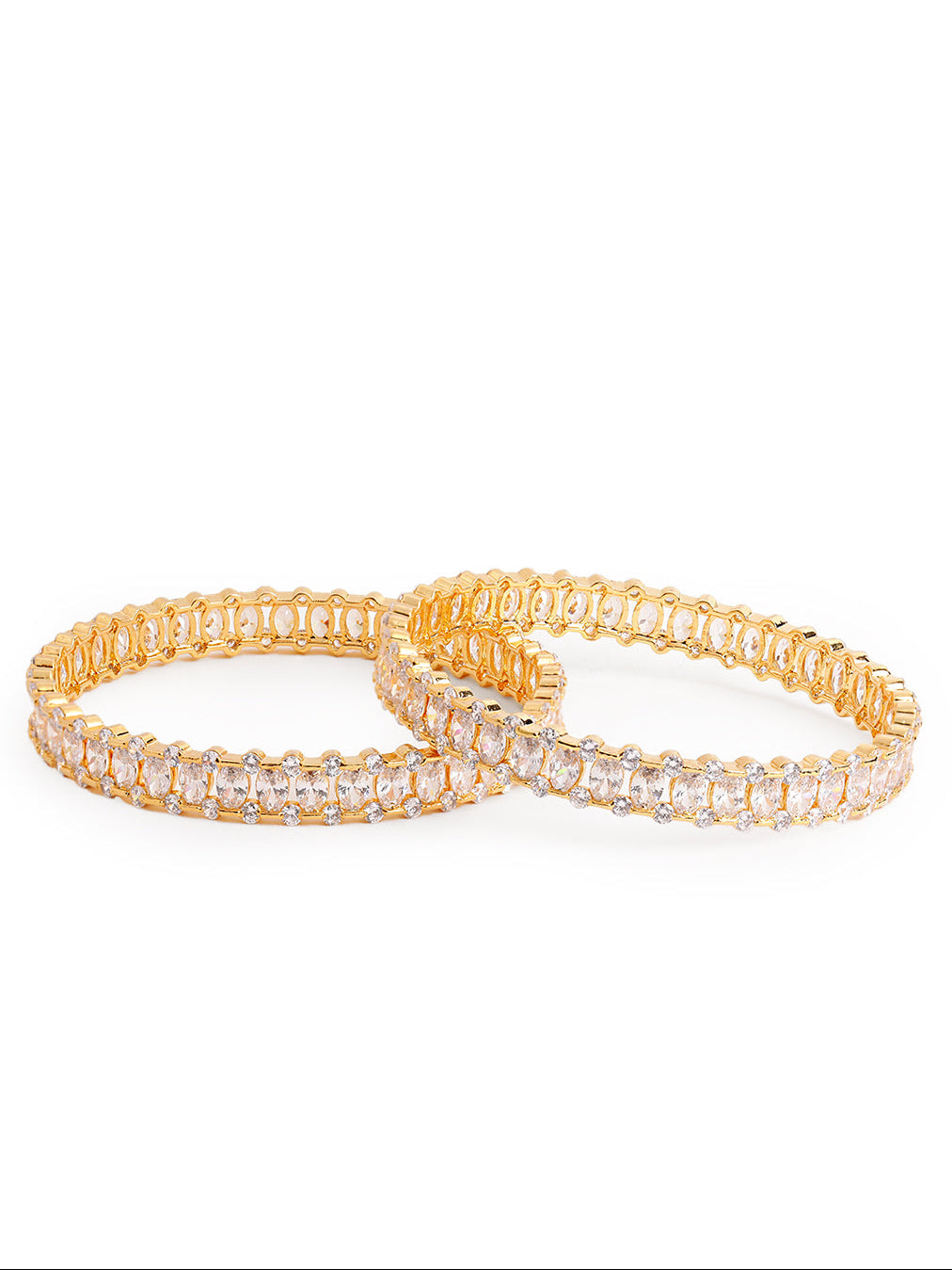 Make a grand statement with these double-row AAA Cubic Zircon stones studded set of 2 bangles, crafted in a gold-toned finish with alternating oval and round-cut brilliance. Their bold yet elegant design makes them perfect for weddings, festive occasions, and high-glam evenings. This comes with 1 year plating warranty,