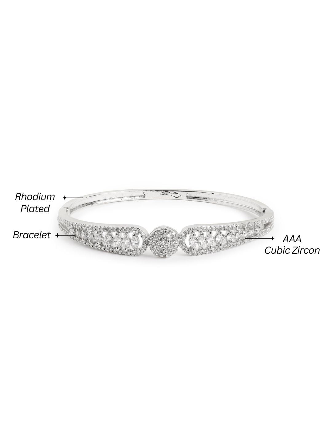 Elevate your look with this sparkling sphere bracelet, designed with a dazzling AAA Cubic Zircon stones studded centerpiece and rows of shimmering cubic zircon on each side. Bold yet elegant, it’s the perfect choice for cocktail nights, parties, or festive occasions. Secured with clip on closure. This comes with 1 year plating warranty, anti-tarnish for lasting shine and comfort. Size upto 2.6