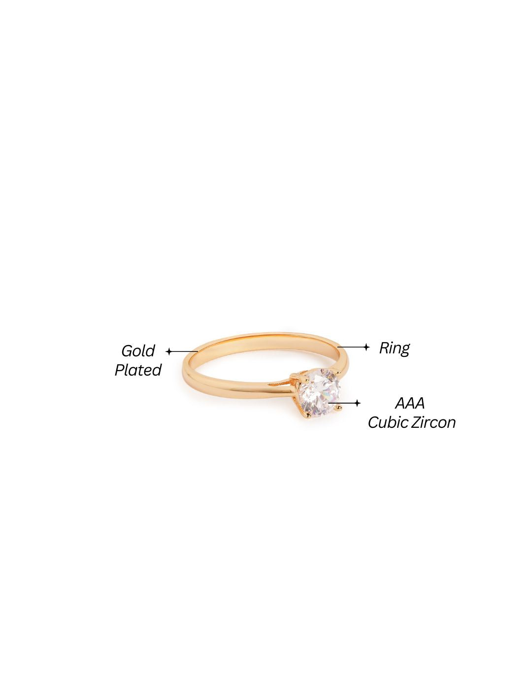 Step into timeless elegance with this solitaire ring. Featuring a brilliant round-cut AAA Cubic Zircon set on a sleek gold band, this ring is the epitome of sophistication and grace. Perfect for engagements, anniversaries, or as a signature everyday piece, its radiant sparkle and minimal design make it a jewelry essential that never goes out of style. It is anti-tarnish and come with a one-year plating warranty. Secured with an adjustable shank closure for a comfortable, customizable fit.