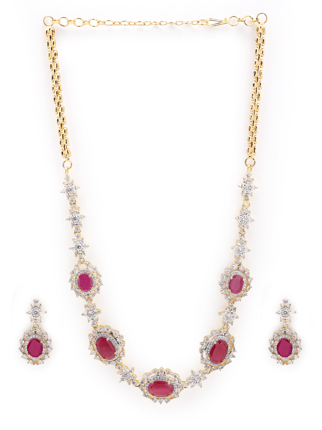 A stunning gold-based AAA american diamond studded ruby necklace set for women, featuring delicate diamond-like stones set. The intricate pendant flows down in a graceful cascade, adding an elegant sparkle to your neckline. Perfect for festive evenings or wedding functions, it blends classic charm with a modern twist. Secured with S-lock closure. This comes with 1 year plating warranty, anti-tarnish for lasting shine and comfort.