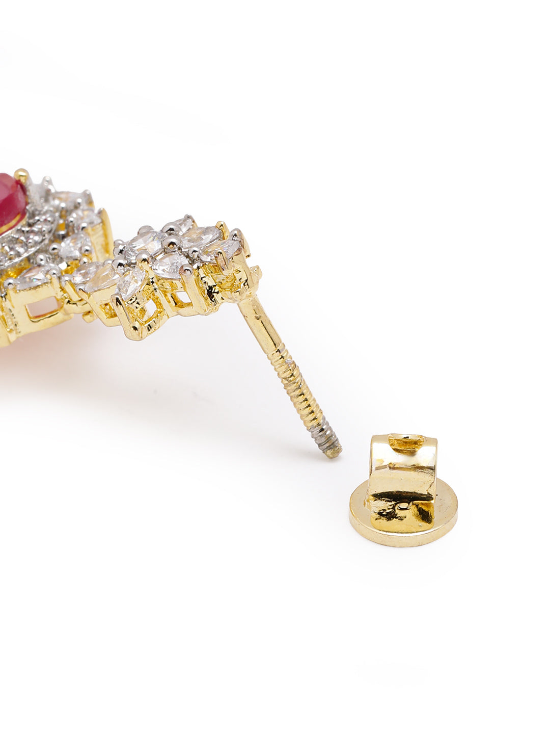 A stunning gold-based AAA american diamond studded ruby necklace set for women, featuring delicate diamond-like stones set. The intricate pendant flows down in a graceful cascade, adding an elegant sparkle to your neckline. Perfect for festive evenings or wedding functions, it blends classic charm with a modern twist.