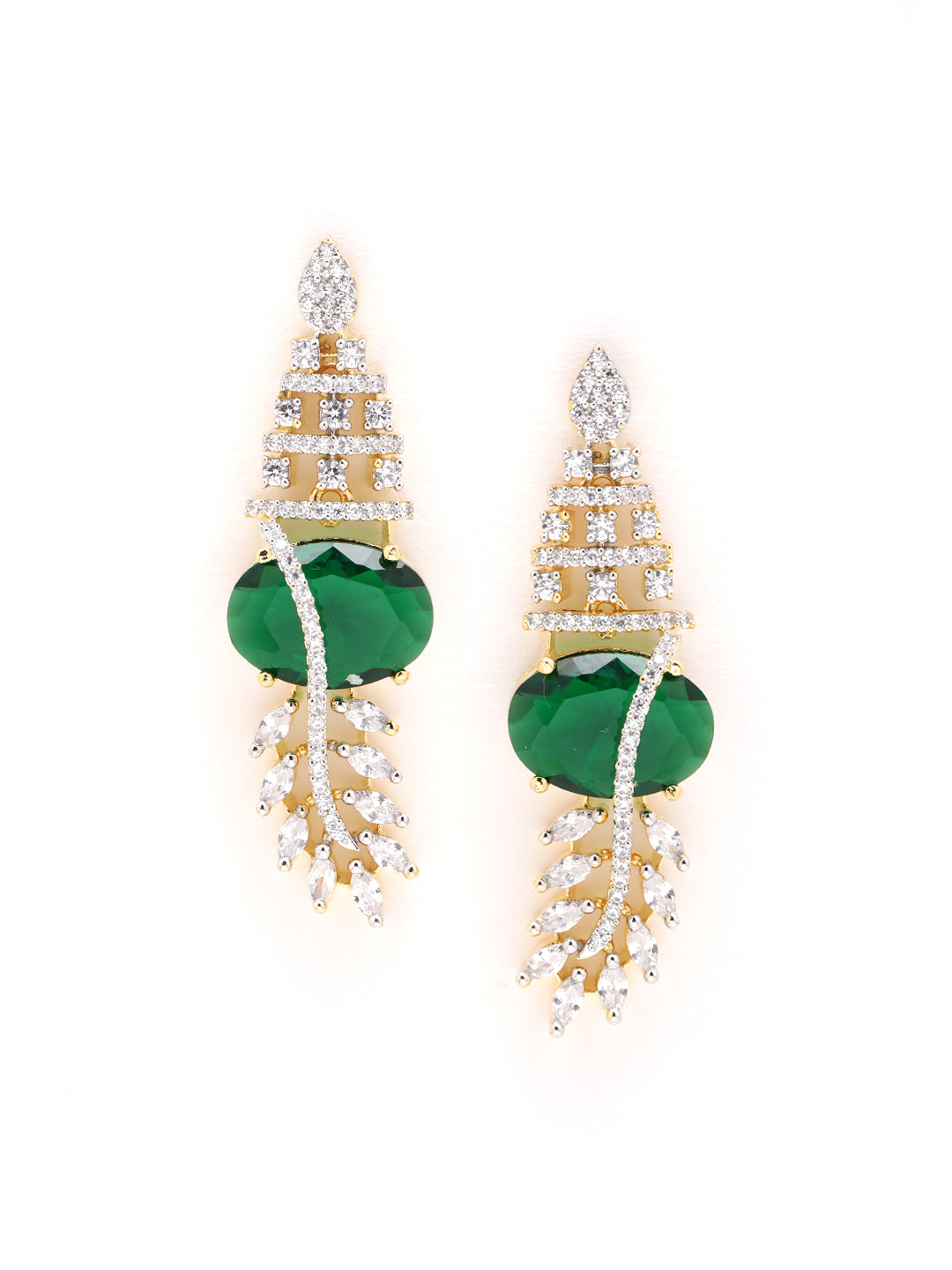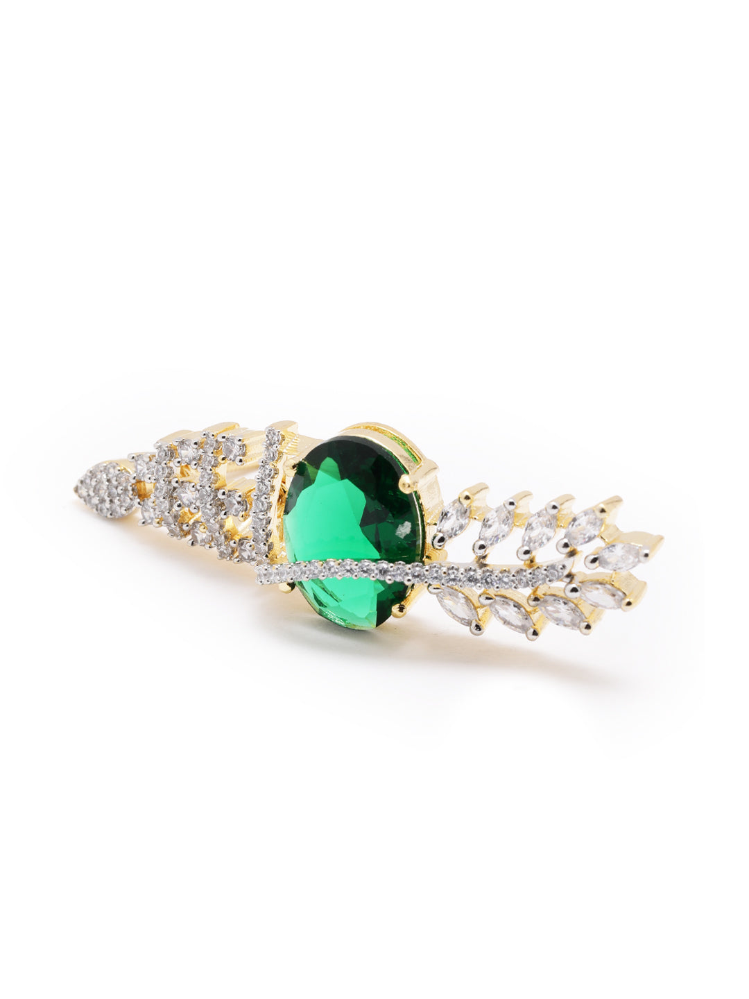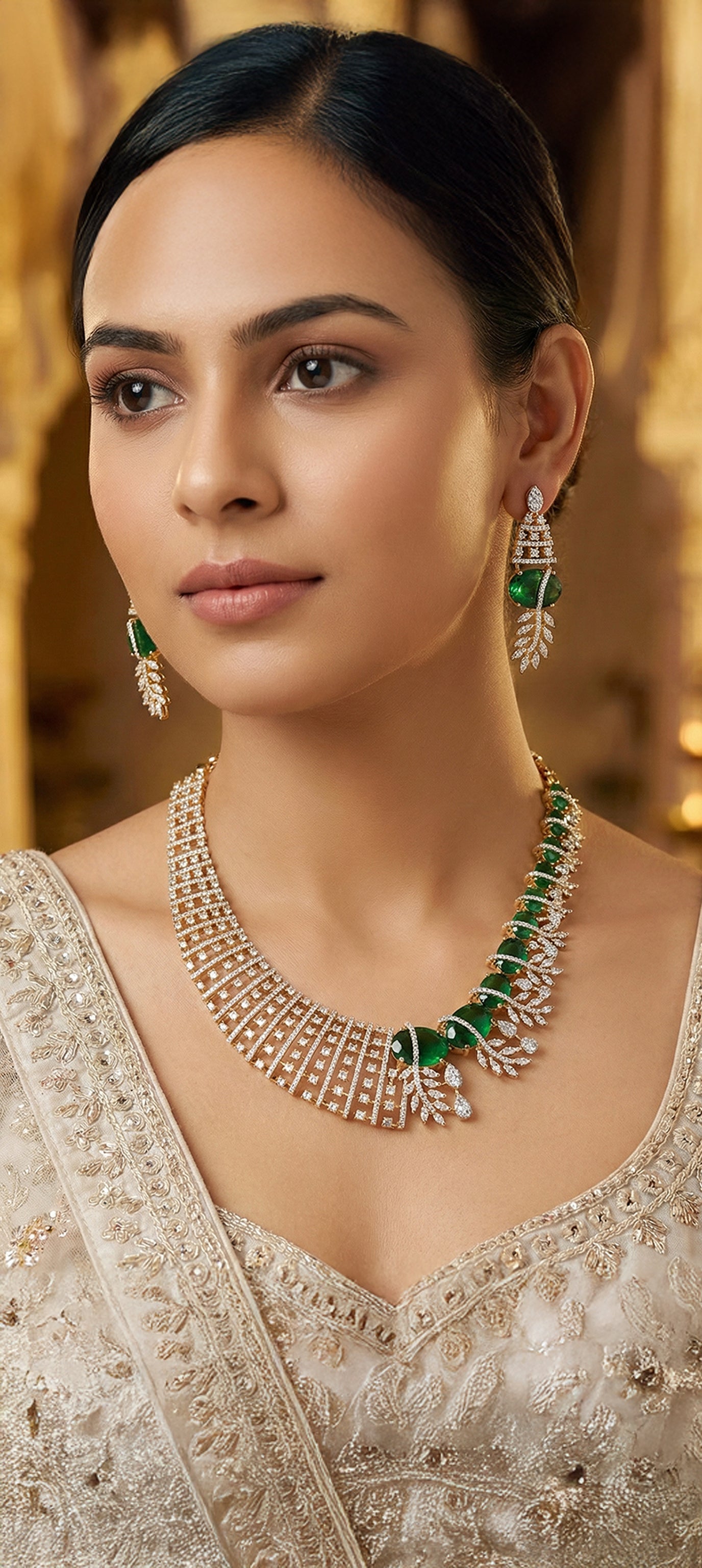 Inspired by nature’s elegance, this AAA american diamond emerald studded necklace set features on a gold frame. The cascading floral drop at the center adds charm and grace perfect for festive occasions, evening wear and gifting to your loved ones