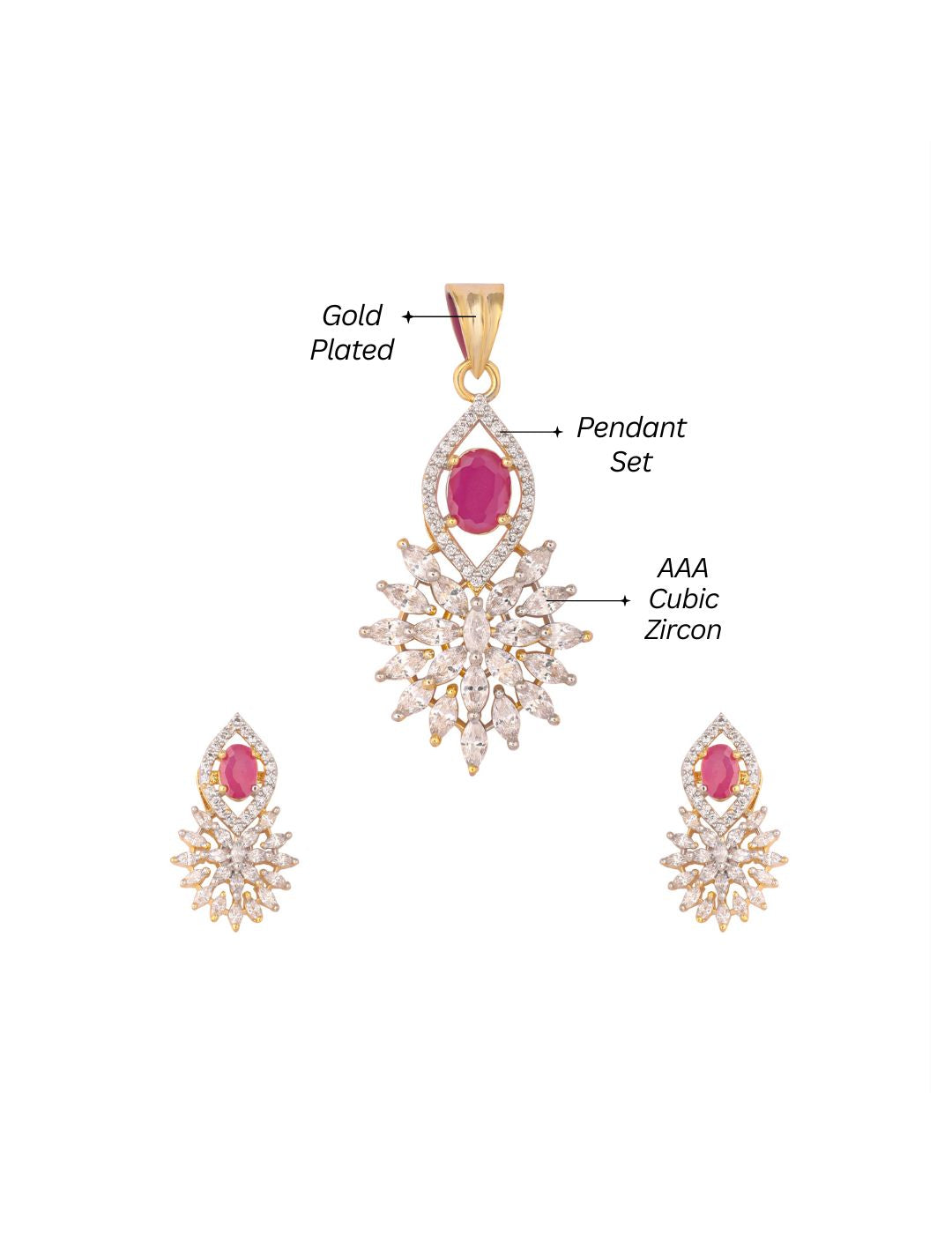 A timeless AAA cubic zircon pendant set in ruby stone at its centre, perfect for everyday elegance & ideal for gifting. Secured with screw-back closure. This Pendant necklace for women comes with AAA cubic zircon pendant and a pair of matching earrings. It has 1 year plating warranty and is anti-tarnish for lasting