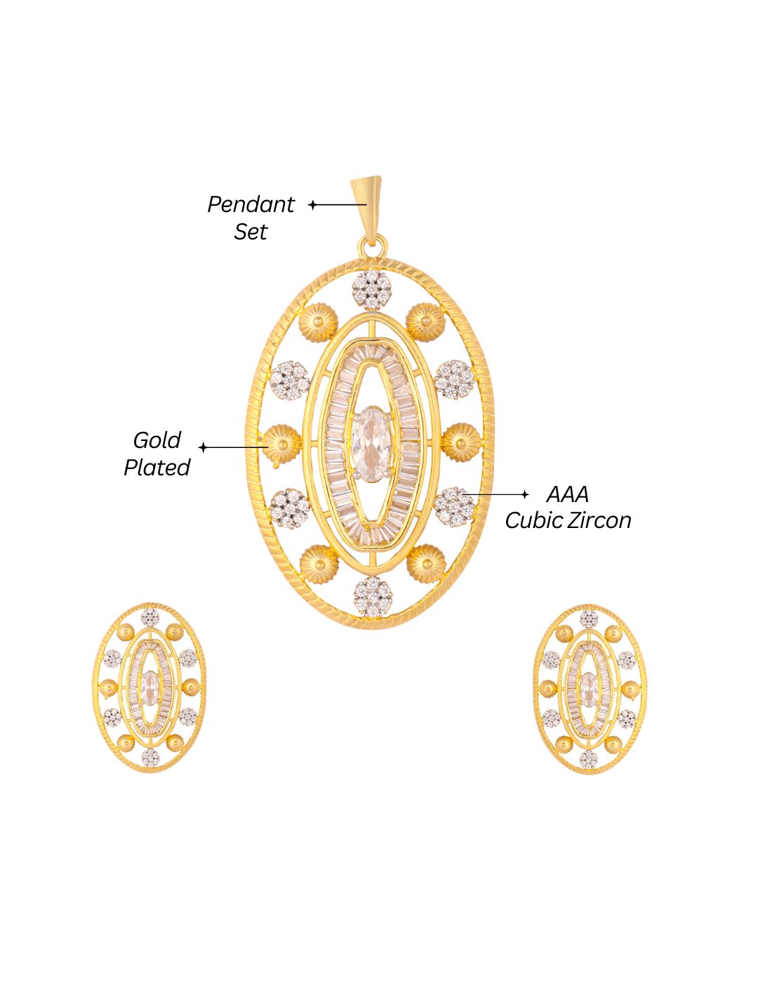 A royal pendant set crafted in a bold oval design, highlighted with baguette-cut brilliance, shimmering AAA cubic zircon stones, and golden accents. A true statement piece that blends traditional charm with modern elegance. Secured with screw-back closure. This Pendant necklace for women comes with AAA cubic zircon pen