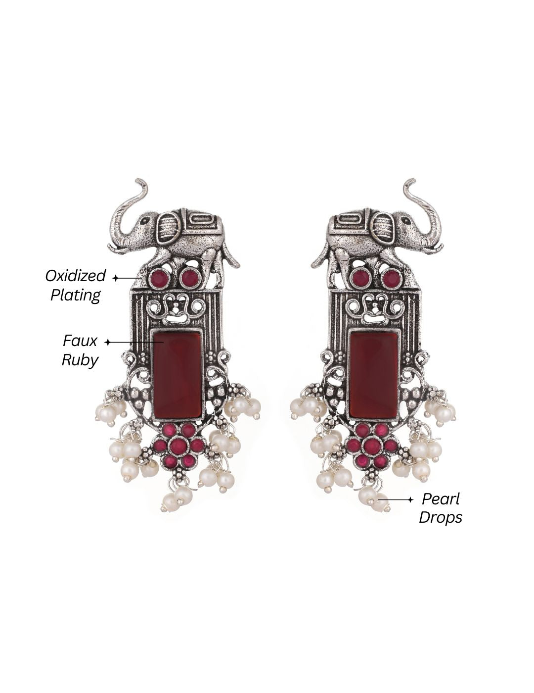 Oxidized silver earrings featuring an intricate elephant motif, bold red stone centre piece, and delicate pearl drops. A perfect blend of tradition and statement style for festive and ethnic looks, these earrings are perfect for weddings, and festive occasions. Secured with push back closure. This comes with 1 year pla