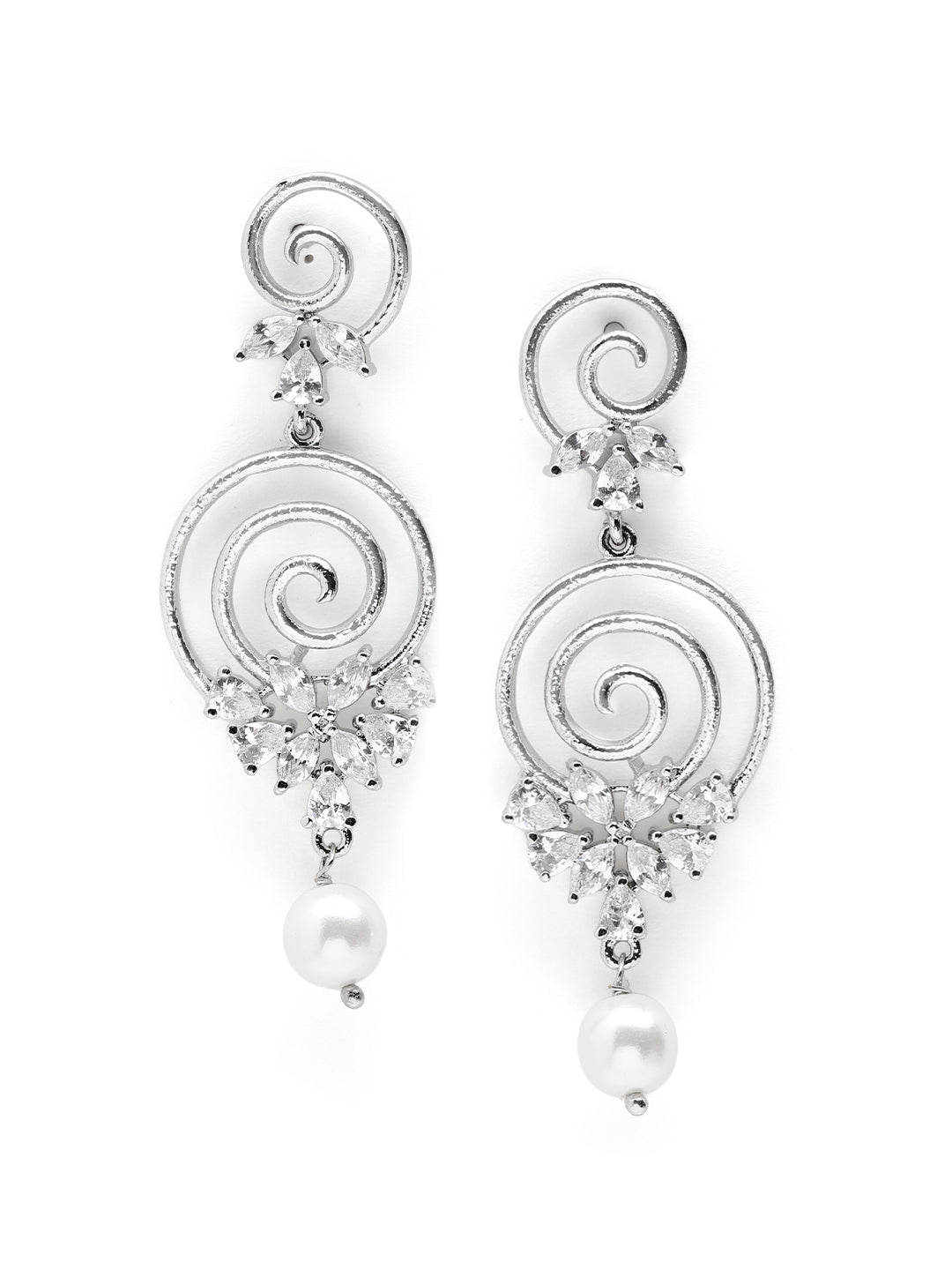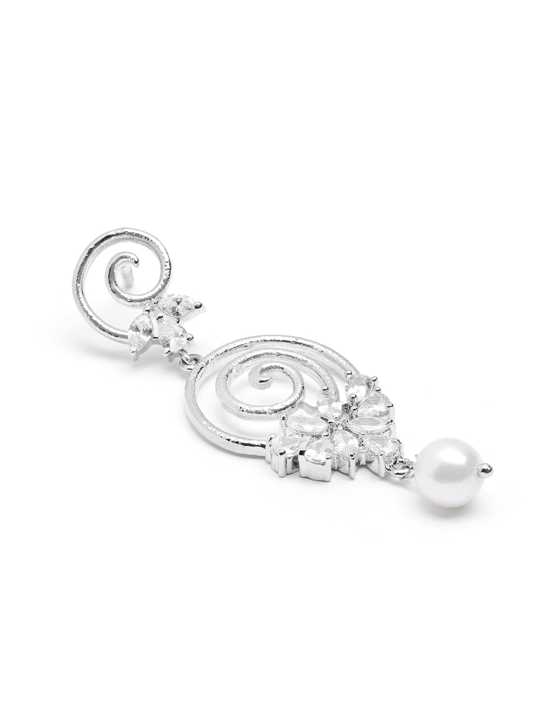 Dazzle in elegance with these cascading american diamond stone spiral theme earrings, featuring delicate zircon. A perfect fusion of sparkle and sophistication for evening glamour. This comes with 1 year plating warranty, anti-tarnish for lasting shine and comfort.