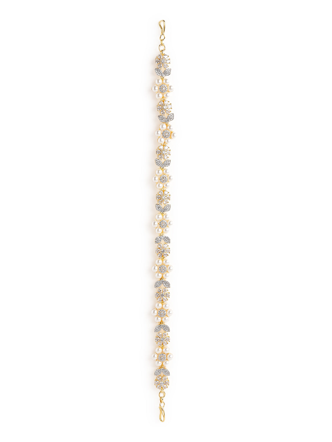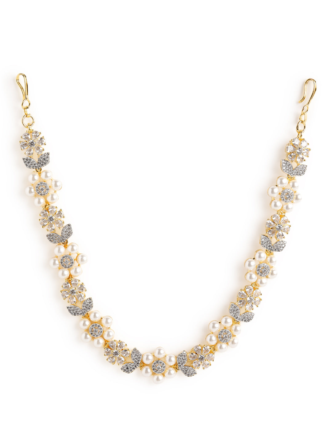 Adorn with timeless elegance in this pearl & AAA Cubic Zircon stones set in matha patti. Featuring delicate clusters of pearls paired with sparkling stones in a blooming floral design, it is perfect for weddings, festive occasions, and bridal wear. Its adjustable fit and intricate craftsmanship make it both graceful and versatile. Secured with hook closure. This comes with 1 year plating warranty, anti-tarnish for lasting shine and comfort.
