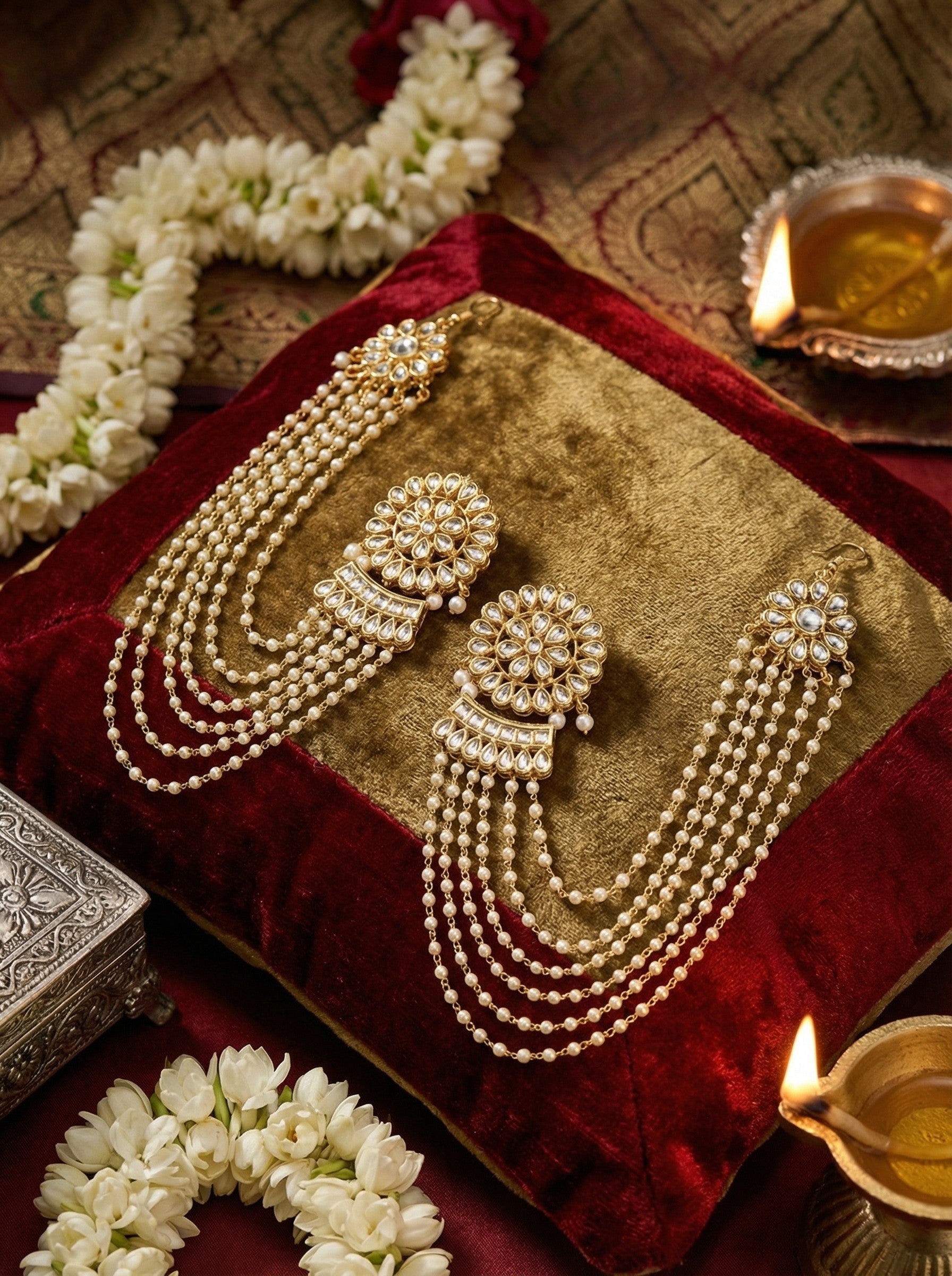 A majestic statement stud earrings featuring kundan floral motifs and cascading pearl-beaded strings attached to a kundan motif. A complete attire package including earrings with head chains attached to a kundan motif A perfect statement piece for bridal and festive looks. The graceful pearls offer a soft, feminine finish, making it ideal for festive events. Designed with anti-tarnish materials, this earring also comes with a one-year plating warranty for lasting shine and elegance during every celebration.