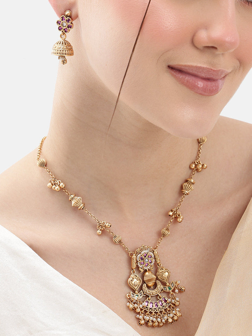A beautifully crafted heritage south indian long necklace set with detailed gold motifs, ruby accents, and layered pearl hangings. Perfect for ethnic occasions and traditional elegance. This necklace set comes with mini jhumki matching earrings. Secured with hook closure. This comes with 1 year plating warranty, anti-tarnish for lasting shine and comfort.