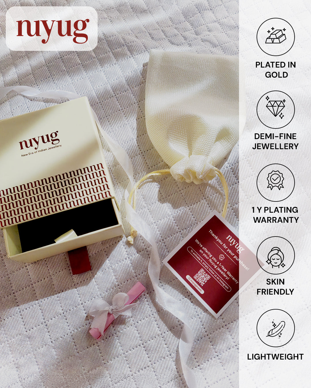 We proudly offer a one-year warranty. If your jewelry experiences plating issues, email us at care@nuyug.com with a photo, and we’ll ensure you’re taken care of!