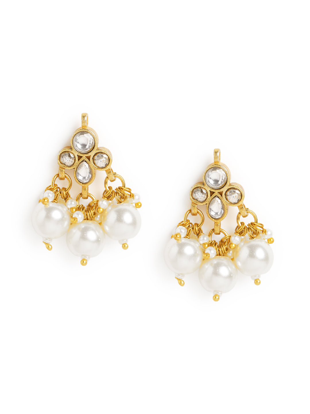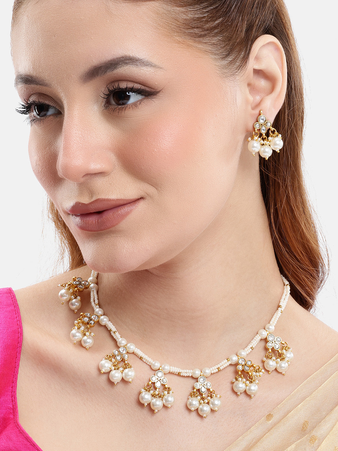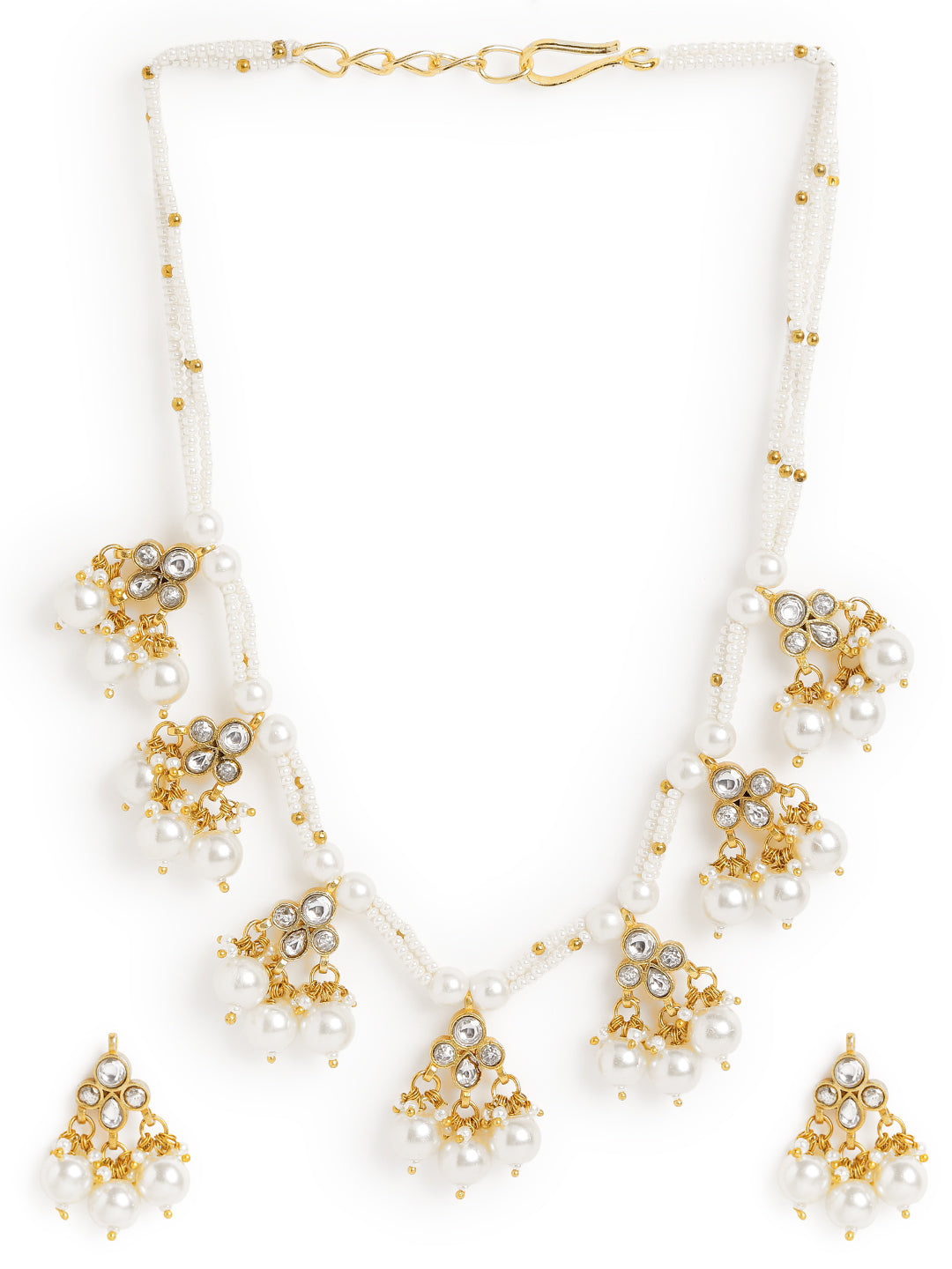 Add regal glamour to your wardrobe with this 22K gold-plated necklace set. Adorned with intricate Kundan and pearl detailing, this set includes a stunning necklace with matching drop earrings. Secured with S-hook closure. This comes with 1 year plating warranty, anti-tarnish for lasting shine and comfort.