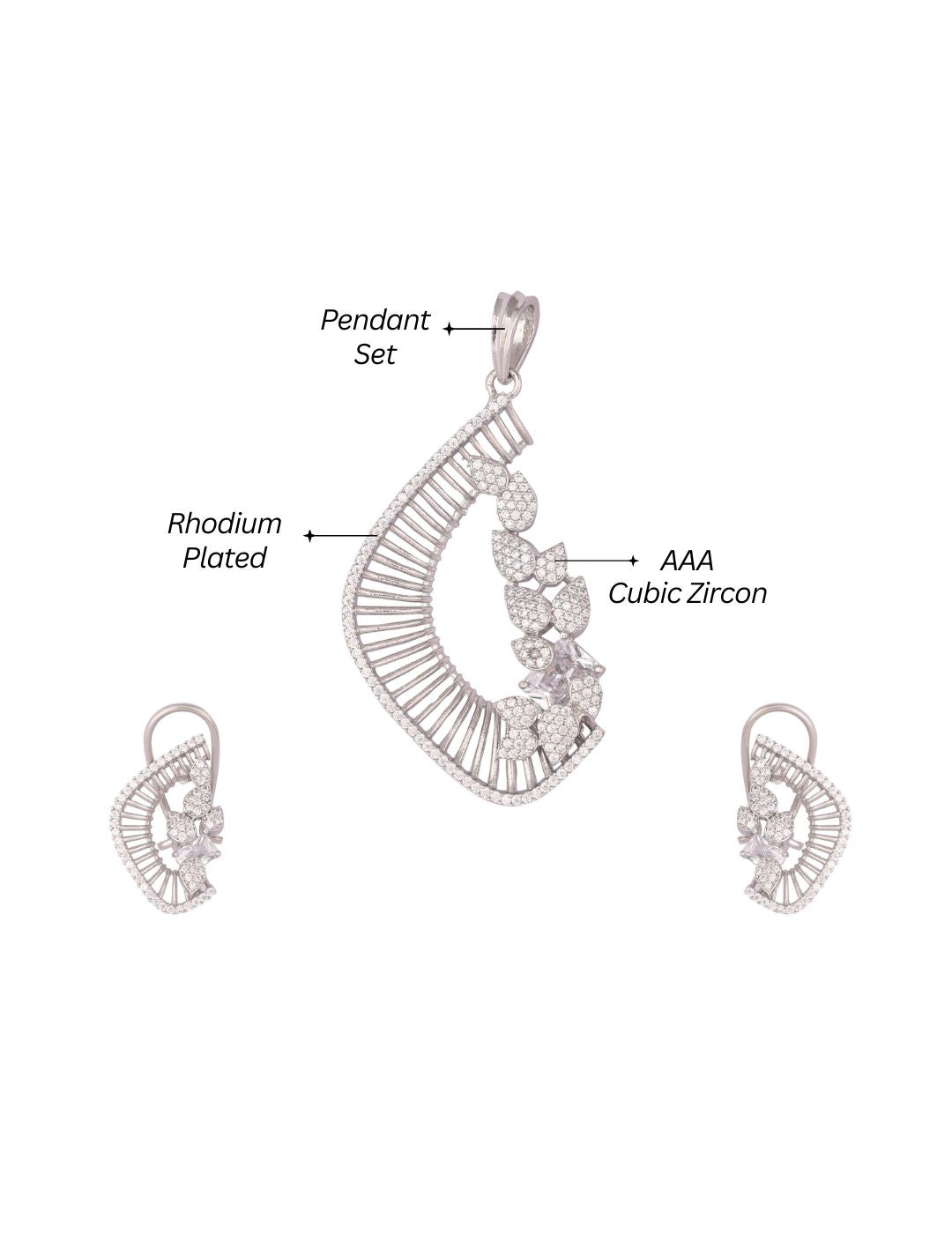A dazzling pendant set with a unique curved design, encrusted with shimmering AAA cubic zircon stones and floral inspired accents. Its modern silhouette and sparkling finish make it a perfect choice for statement style. Secured with screw-back closure. This Pendant necklace for women comes with AAA cubic zircon pendant and a pair of matching earrings. It has 1 year plating warranty and is anti-tarnish for lasting shine and comfort.