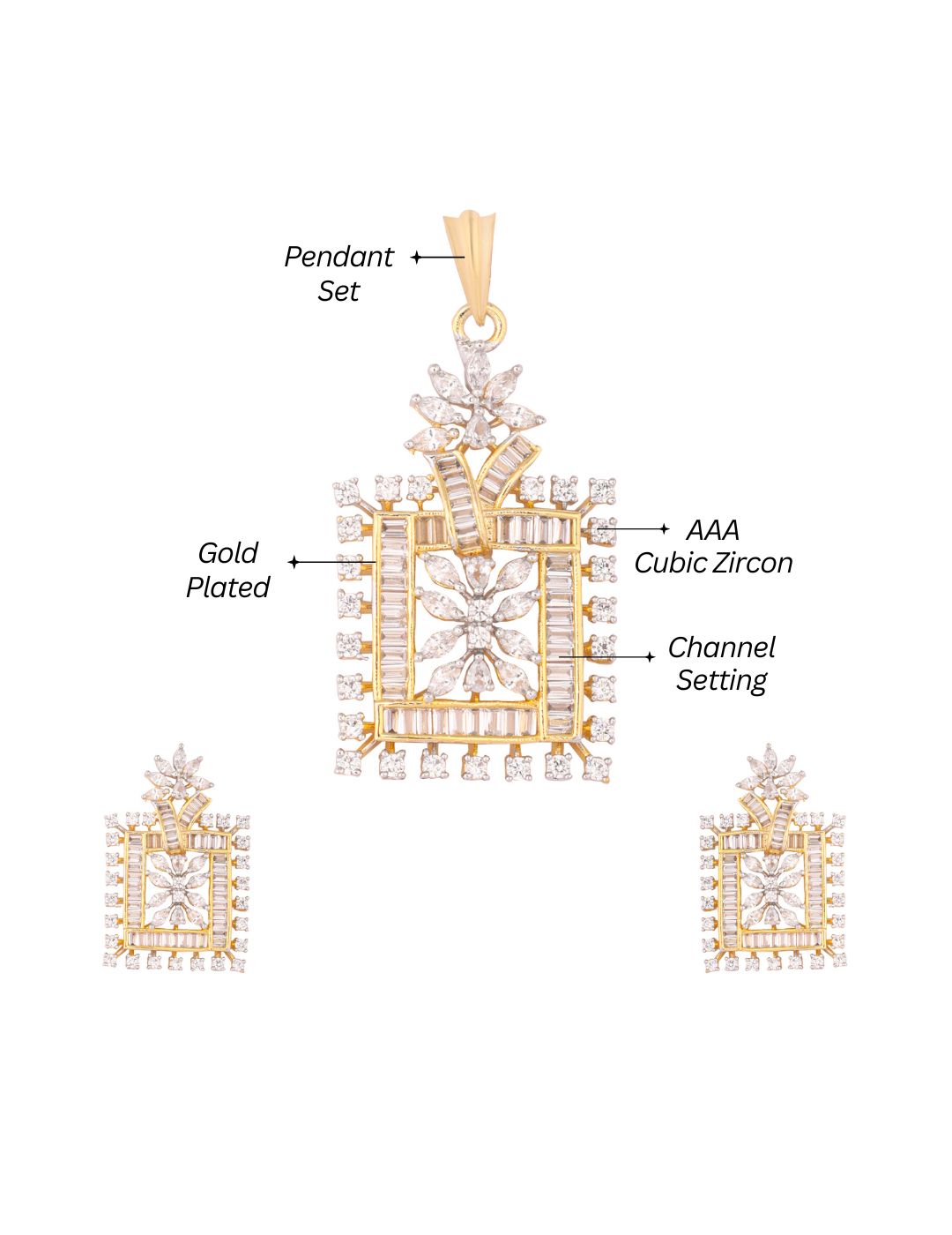 An elegant pendant set with a striking square design, adorned with baguette and round-cut AAA cubic zircon stones, and a floral marquise arrangement in the centre. Its geometric elegance makes it a true statement piece for festive and evening wear, that blends traditional charm with modern elegance. Secured with screw-back closure. This Pendant necklace for women comes with a pendant and a pair of matching earrings. It has 1 year plating warranty and is anti-tarnish for lasting shine and comfort.