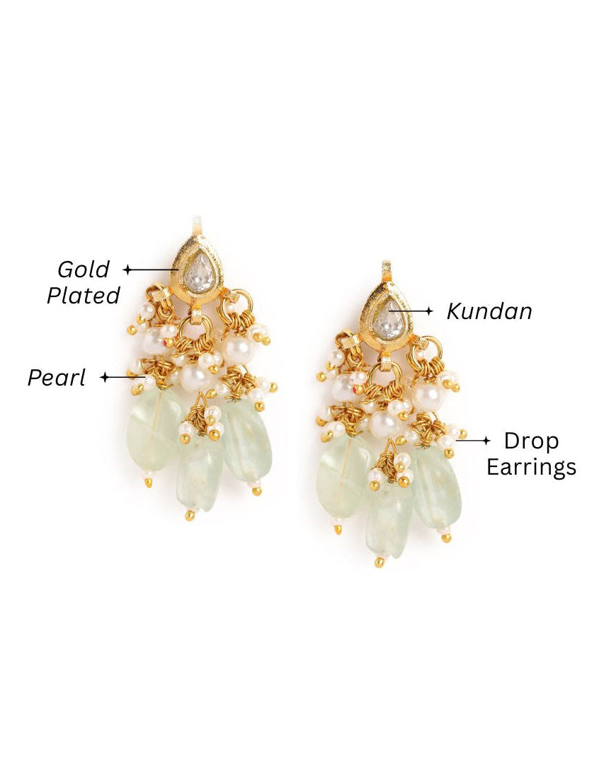 22K Gold Plated, this ethereal set features layered pearls anchored by a dazzling polki centrepiece and light green bead drops. Accompanied by earrings, it offers the perfect harmony of royal tradition and modern bridal finesse. Secured with adjustable drawstring closure. This comes with 1 year plating warranty, anti-t
