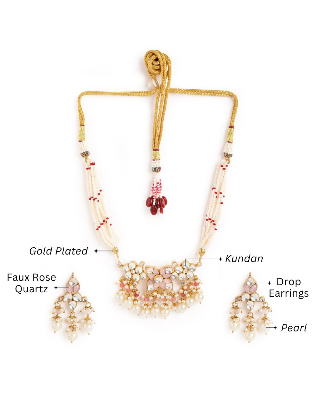 Add regal glamour to your wardrobe with this 22K gold-plated semi-precious stone necklace set. Adorned with intricate semi-precious rose quartz stones, complemented by Kundan, pearl and enamel detailing, this set includes a stunning necklace with matching drop earrings. Secured with adjustable drawstring closure. This comes with 1 year plating warranty, anti-tarnish for lasting shine and comfort.