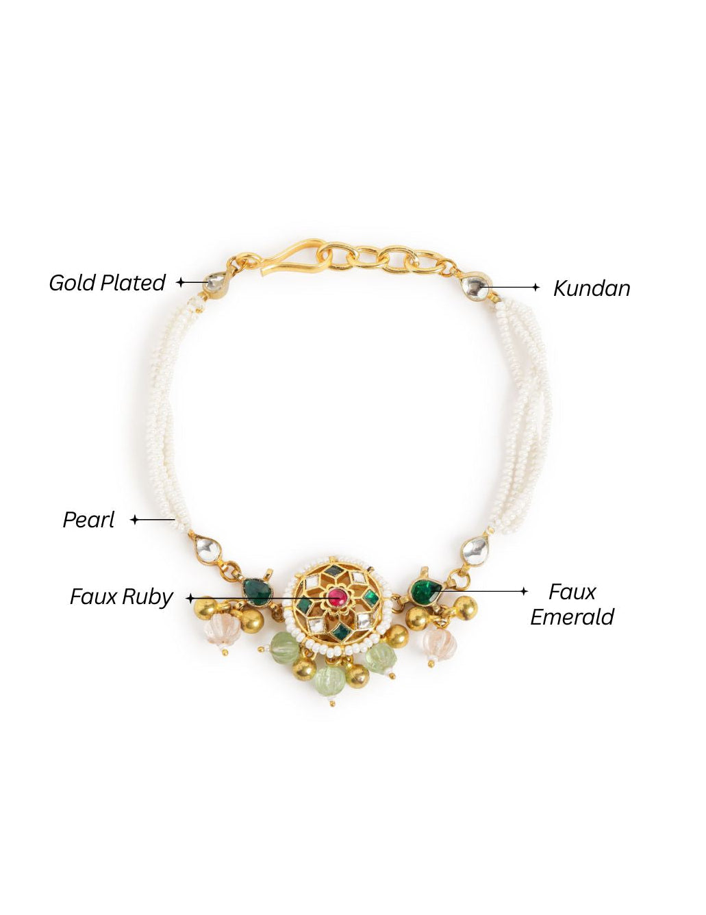 Adorn your hands with royal charm through this exquisite heritage bracelet, featuring a circular motif embellished with ruby red and green stones, pearls, and intricate pearl detailing. The multi-strand pearl chain adds grace and sophistication, making it a perfect choice for weddings, mehendi, and festive occasions. Secured with a hook closure. It’s anti-tarnish and comes with a one-year plating warranty for lasting brilliance.