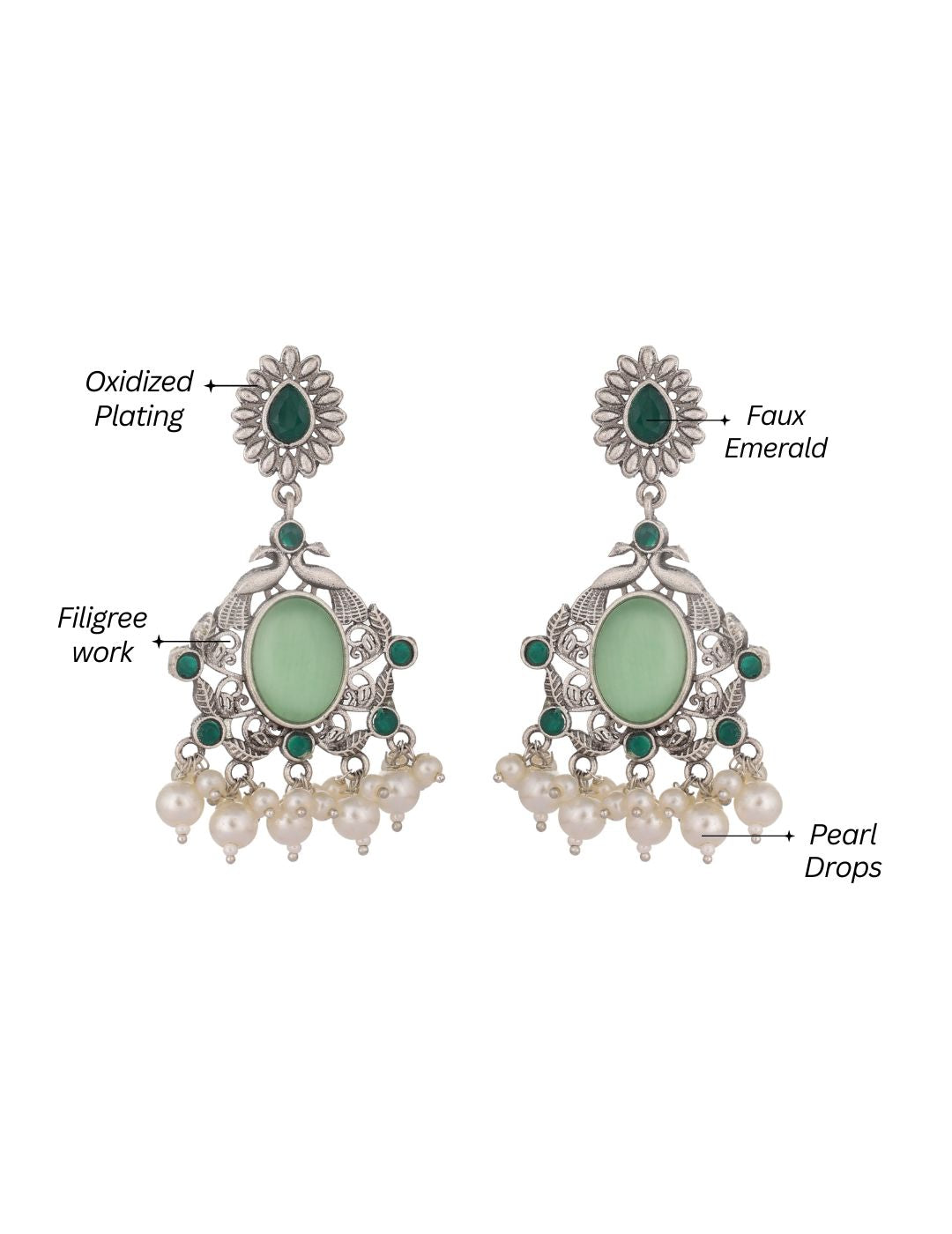 Elegant oxidized silver earrings featuring soothing green oval stones, accented with delicate pearl drops and intricate detailing. A graceful blend of earthy charm and traditional beauty. Secured with push back closure. This comes with 1 year plating warranty, anti-tarnish for lasting shine and comfort.