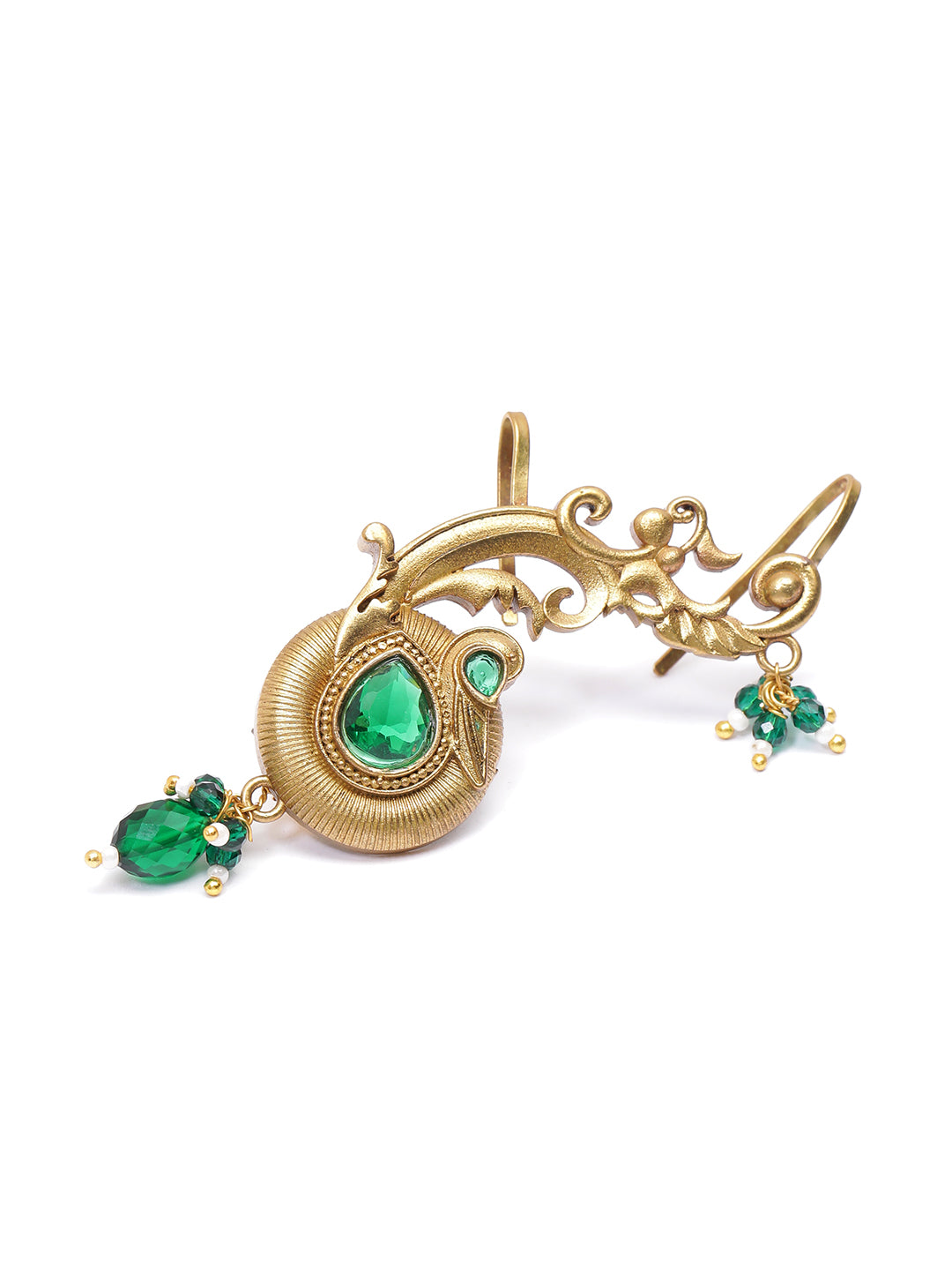 A regal, handcrafted peacock green earcuff earrings inspired by the graceful form of a peacock tail. Designed in antique gold with deep-green stones, this piece blends temple artistry with a modern sculptural silhouette. Perfect for weddings, festive looks, and statement styling. Secured with push back closure.