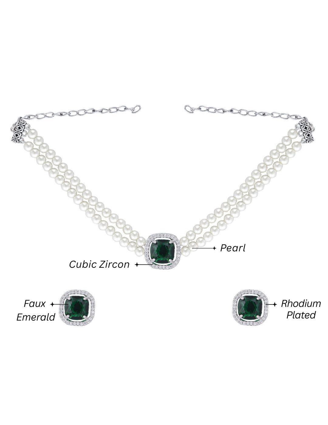Elegant pearl choker featuring striking green emerald centre piece. Perfect for celebrations, this set brings a pearly charm to traditional elegance. This comes with 1 year plating warranty, anti-tarnish and hypoallergenic for lasting shine and comfort.