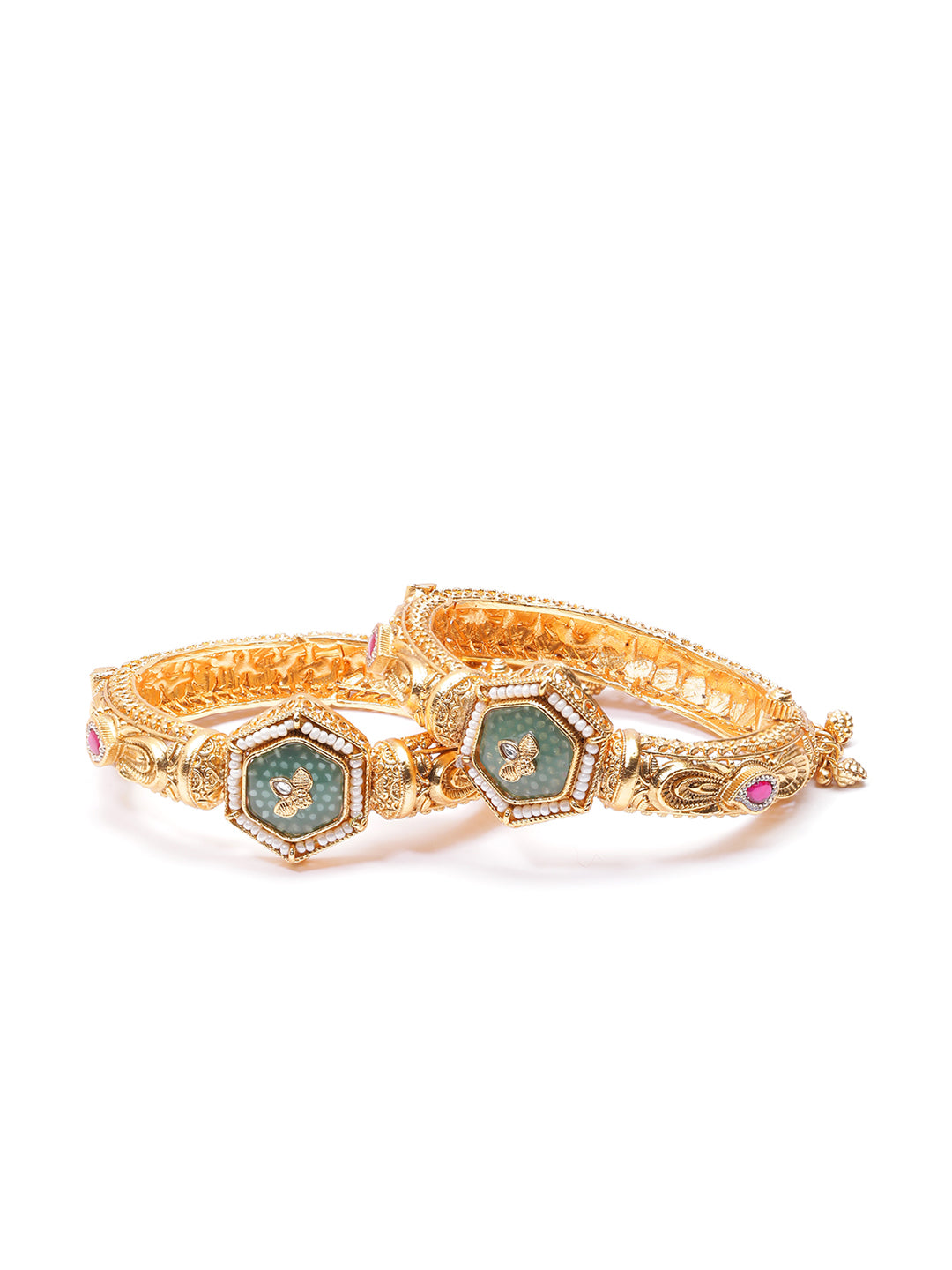 This handcrafted heritage gold bangle set for women showcases intricate temple-inspired detailing with a green hexagon centrepiece and pearl edging. Ruby stone highlights and rich antique work make it a beautiful match for sarees and traditional outfits. Secured with screw closure. This comes with 1 year plating warran