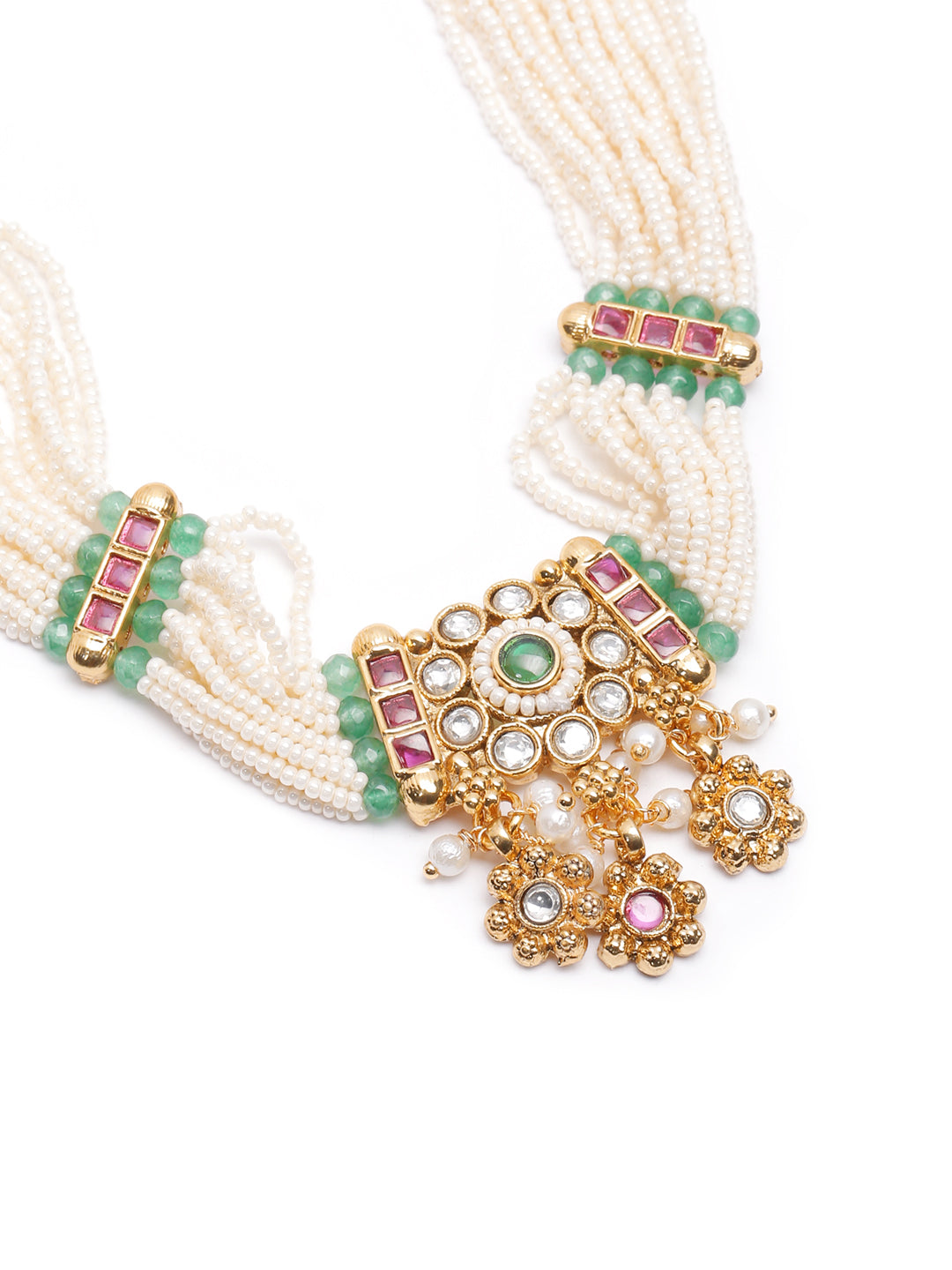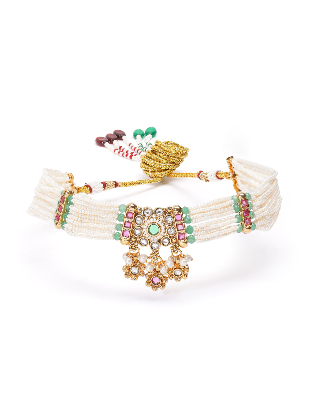 A delicate pearl-strand traditioal gold choker set for women featuring kundan motifs, emerald accents, and soft pearl droppings. Paired with matching earrings for an elegant traditional look. Secured with adjustable drawstring closure. This comes with 1 year plating warranty, anti-tarnish for lasting shine and comfort.