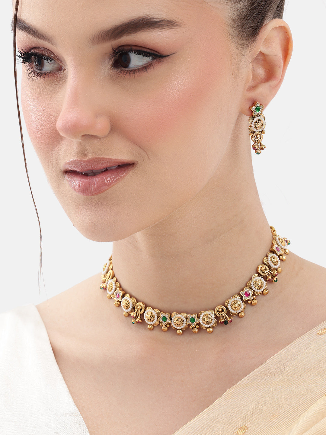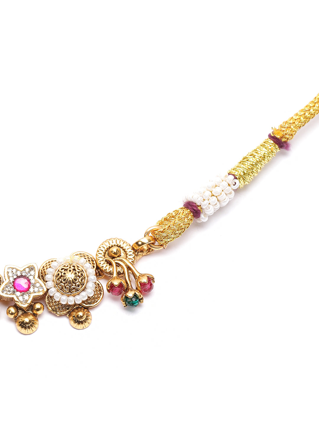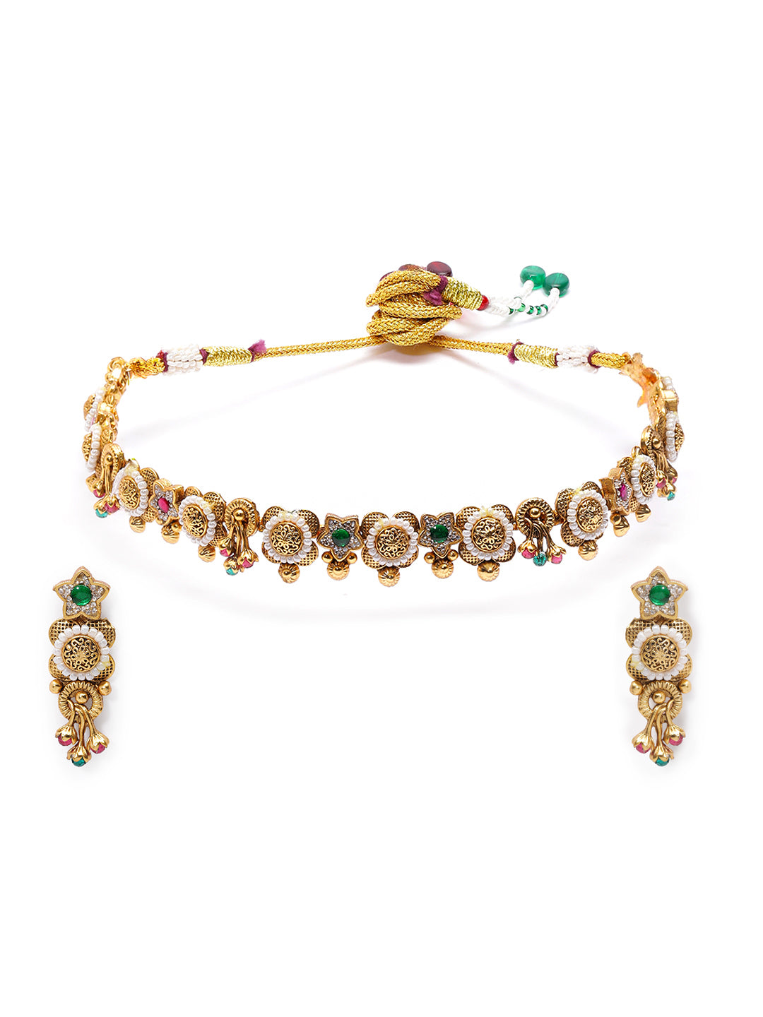 A delicate kanthi necklace set for women crafted with gold-toned detailing, white beaded accents, and hints of green and pink stones. Its intricate petal motifs give it a charming, traditional appeal, perfect for festive and cultural occasions. This necklace set comes with matching drop earrings. Secured with hook clos