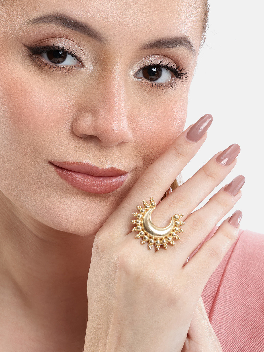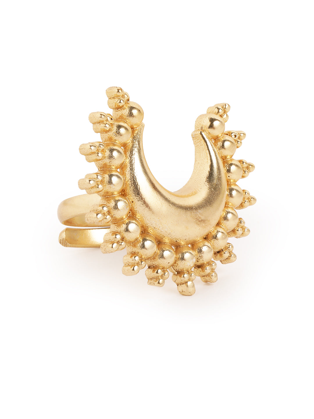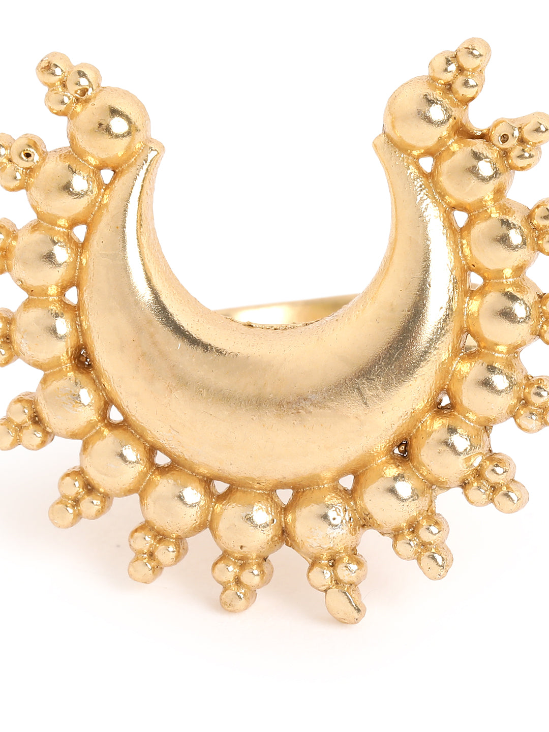 Make a bold statement with this ring, crafted in a radiant gold-toned finish and edged with delicate bead detailing. Bold yet versatile, this piece brings a touch of cosmic charm to festive celebrations or cocktail nights. This statement ring is anti-tarnish and come with a one-year plating warranty. Secured with an ad