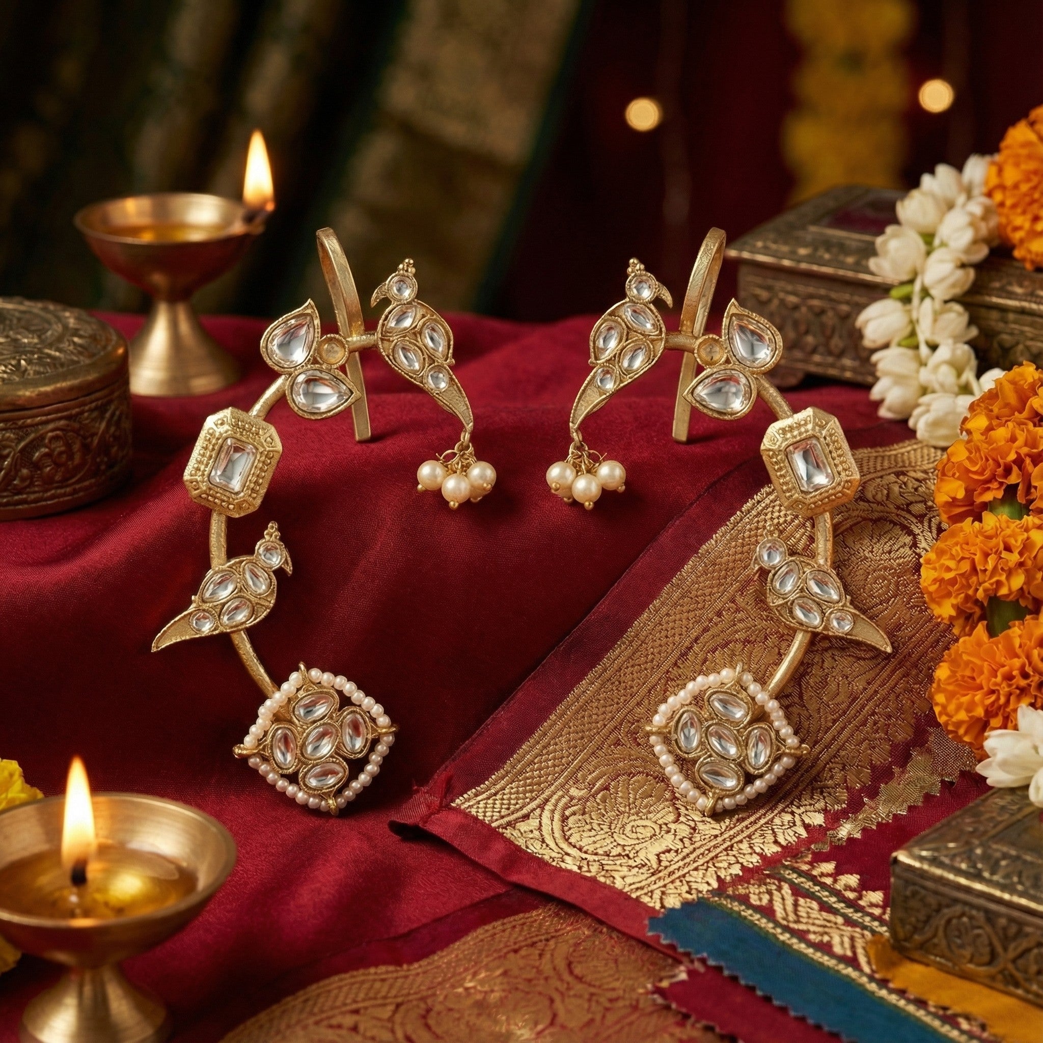 Gold toned, A regal ear adornment that curves elegantly along the ear, featuring twin peacock motifs, floral kundan accents, and a pearl bordered charm. The matte gold finish enhances its royal appeal, making it a perfect no-piercing statement piece for festive and bridal looks. Secured with push back closure. This comes with 1 year plating warranty and anti-tarnish for lasting shine and comfort.